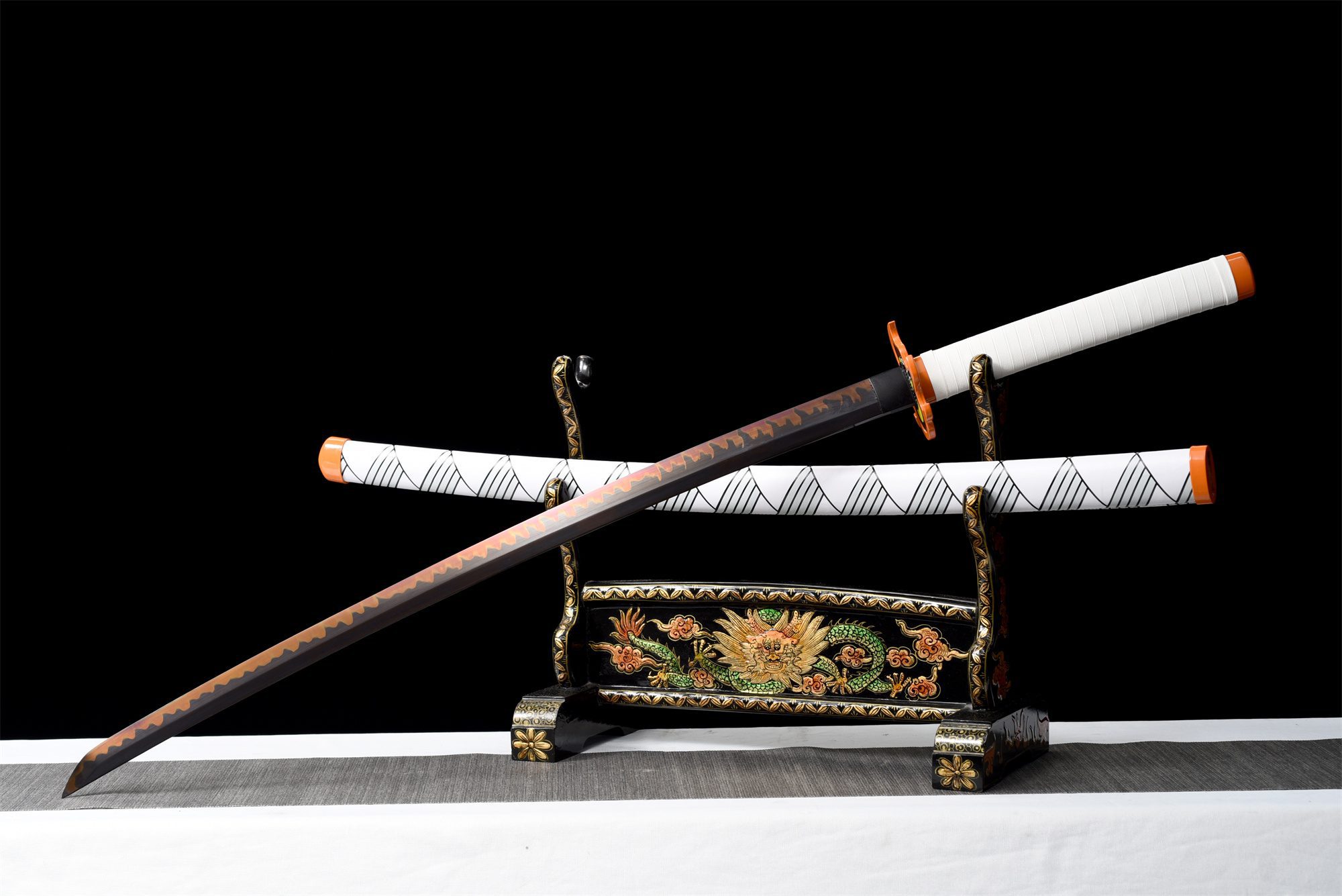 Its T10 steel blade features a black and orange finish reminiscent of the flames characteristic of Rengoku’s fighting style. The genuine flame-shaped midare hamon, achieved through differential tempering, undulates along the edge like an eternal blaze. The flame-shaped tsuba features a bright yellow core surrounded by an orange border, faithfully reproducing the aesthetics of Rengoku’s katana. The handle combines faux stingray skin and wood, wrapped in white leather braiding that provides a firm and comfortable grip. The orange fuchi and kashira harmoniously complete the ensemble, while the black habaki creates a striking contrast. The white lacquered wooden scabbard decorated with black-green patterns evokes the distinctive uniform of the demon slayers, with its orange ends reminiscent of eternal flames.