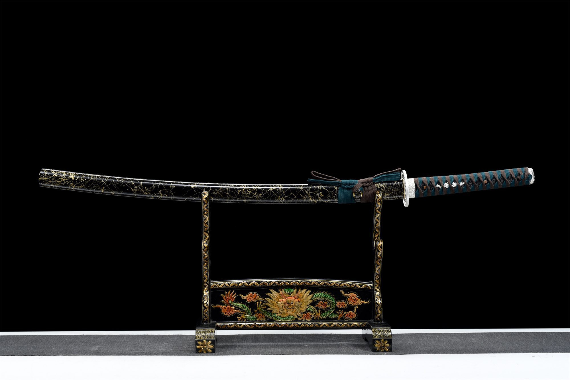 - Scabbard (Saya 鞘): Black lacquered solid wood scabbard with yellow motifs.
