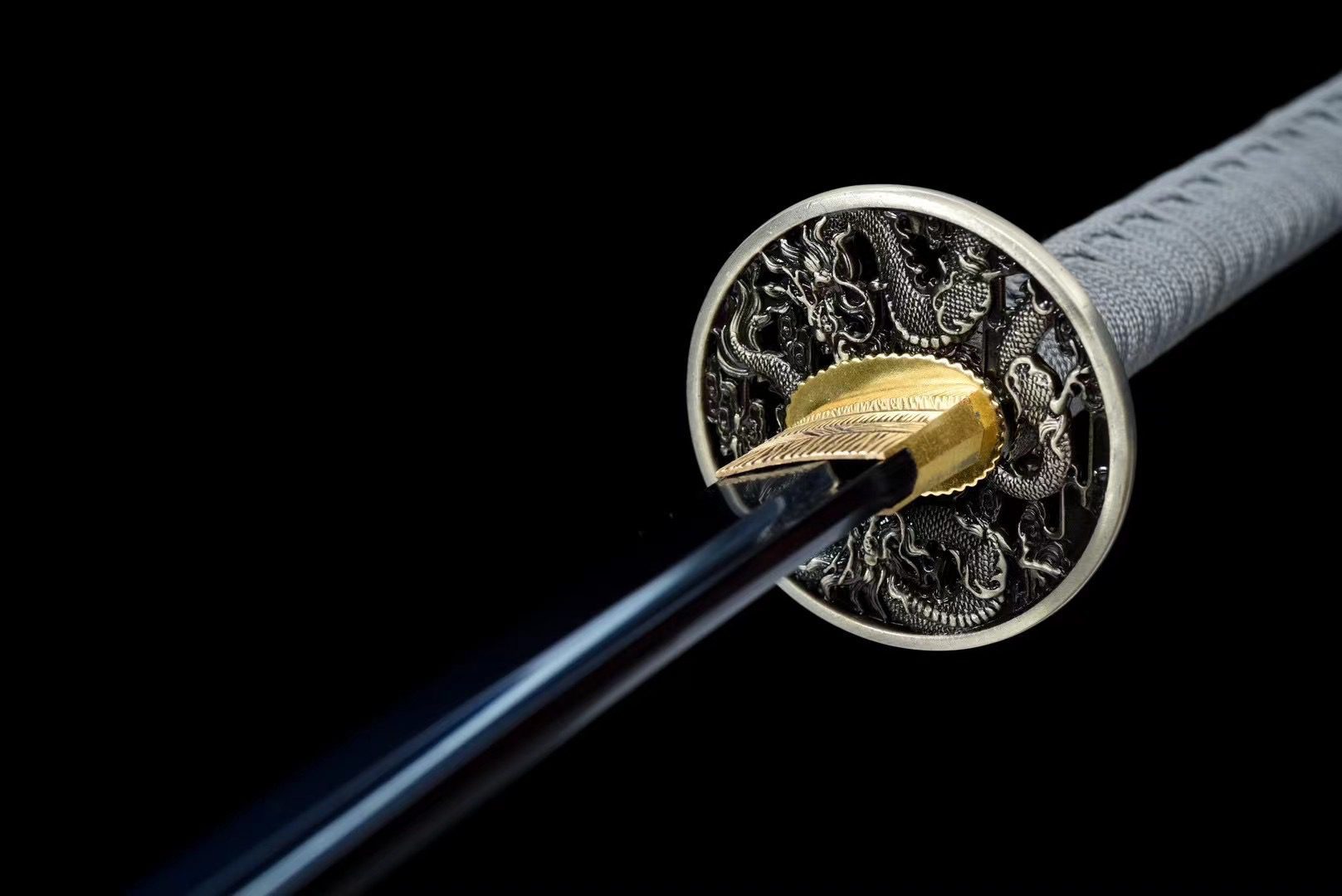 The T10 steel blade features a distinctive blue hue that captures light with remarkable elegance, while the bo-hi carved into the steel lightens the structure and produces a characteristic whistling sound when moved. The silver and black alloy tsuba features a finely chiseled dragon that wraps around the guard, creating a striking visual balance. The handle combines traditional white faux stingray skin with gray diamond-pattern braiding, adorned with menuki representing black dragons that complement the overall aesthetic. The blue lacquered wooden scabbard is adorned with hand-painted white dragons, creating a subtle contrast with the black kojiri and koiguchi ends, while the gray sageo adds the finishing touch to this harmonious ensemble.