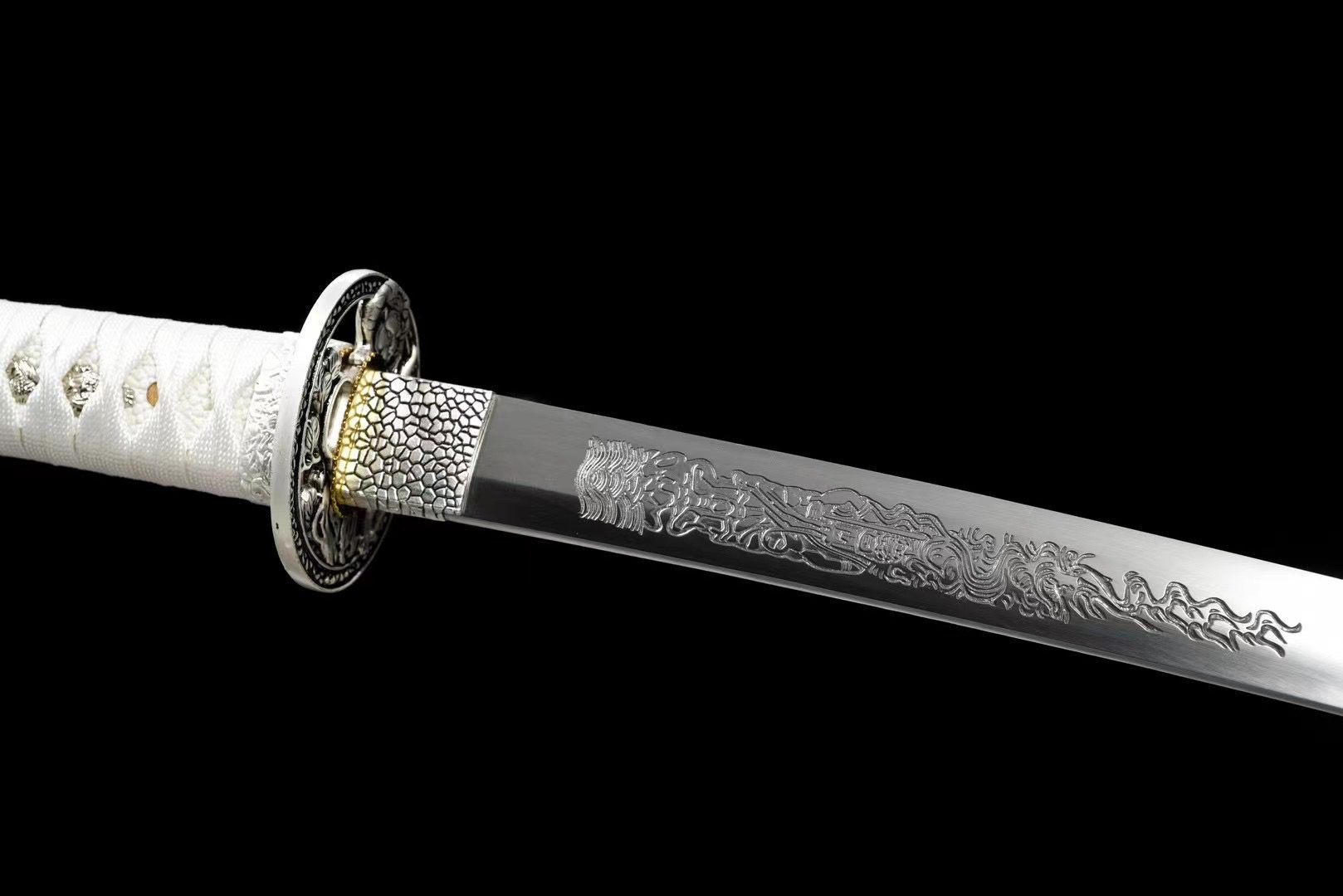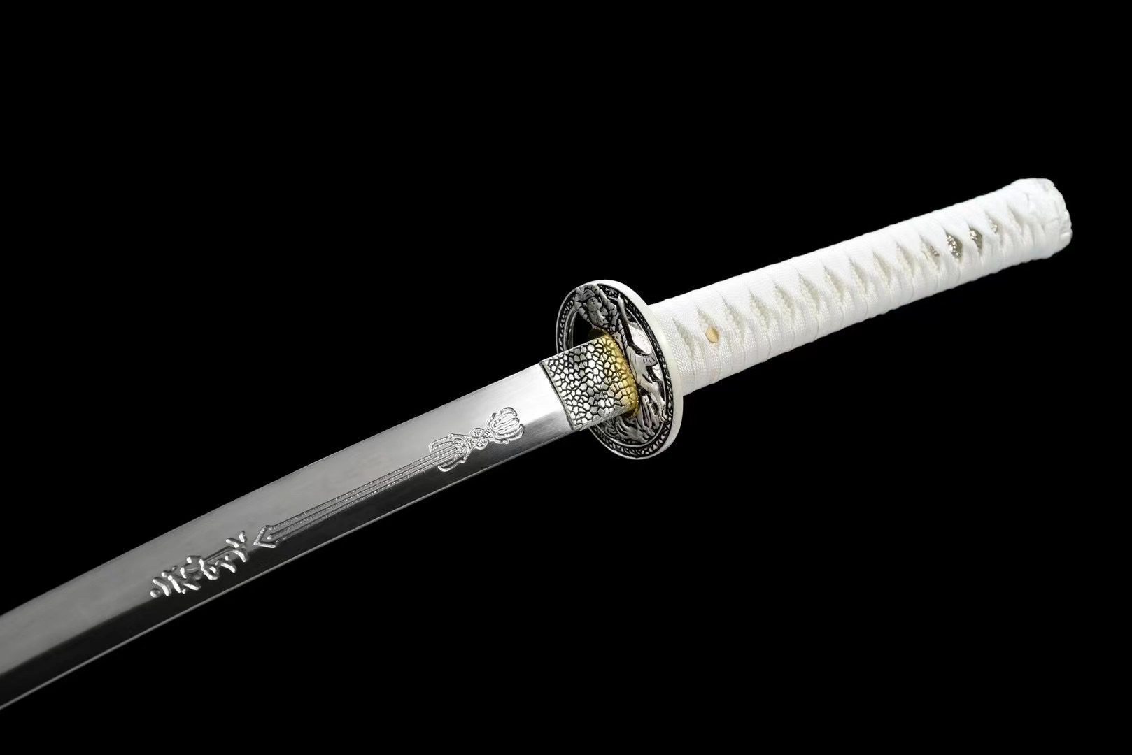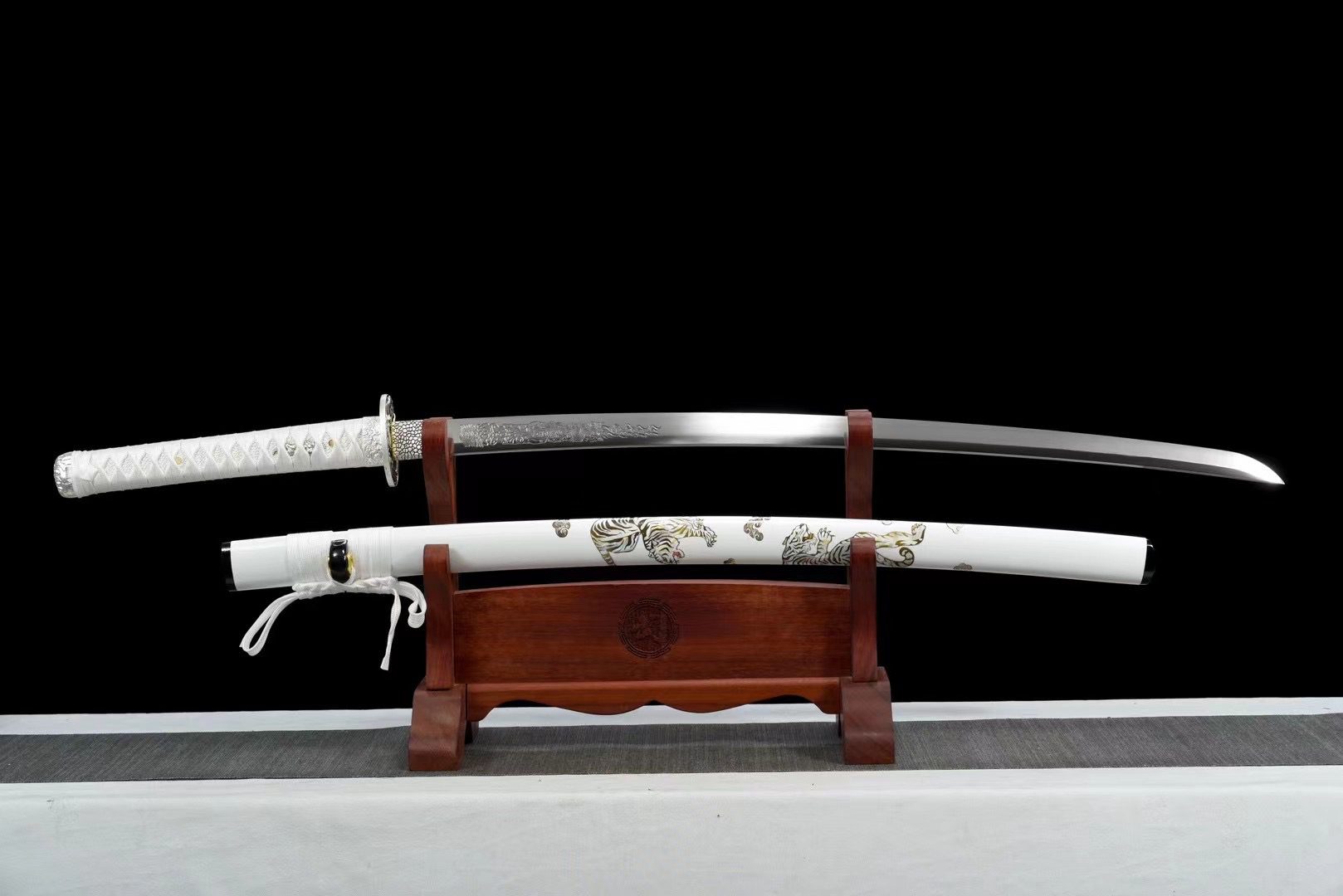 The Byakutora (白虎) or White Tiger katana sword is one of the four divine creatures in Chinese and Japanese mythology. In tradition, the White Tiger represents brute strength tempered by wisdom, as well as protection against evil forces. This katana captures this spiritual essence through its immaculate aesthetics and symbolic details.
