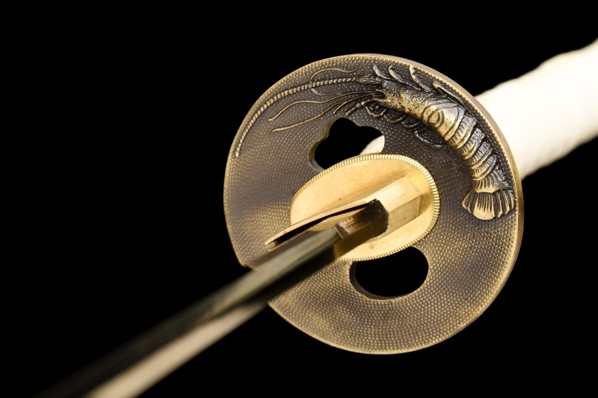 - Guard (Tsuba 鍔): Rounded copper with embossed lobster and kozuka-hitsu for the kogatana.