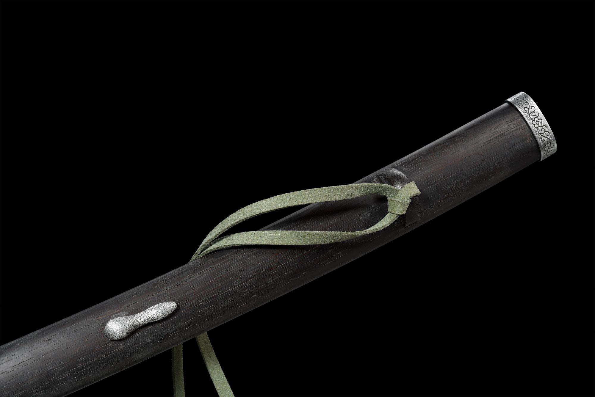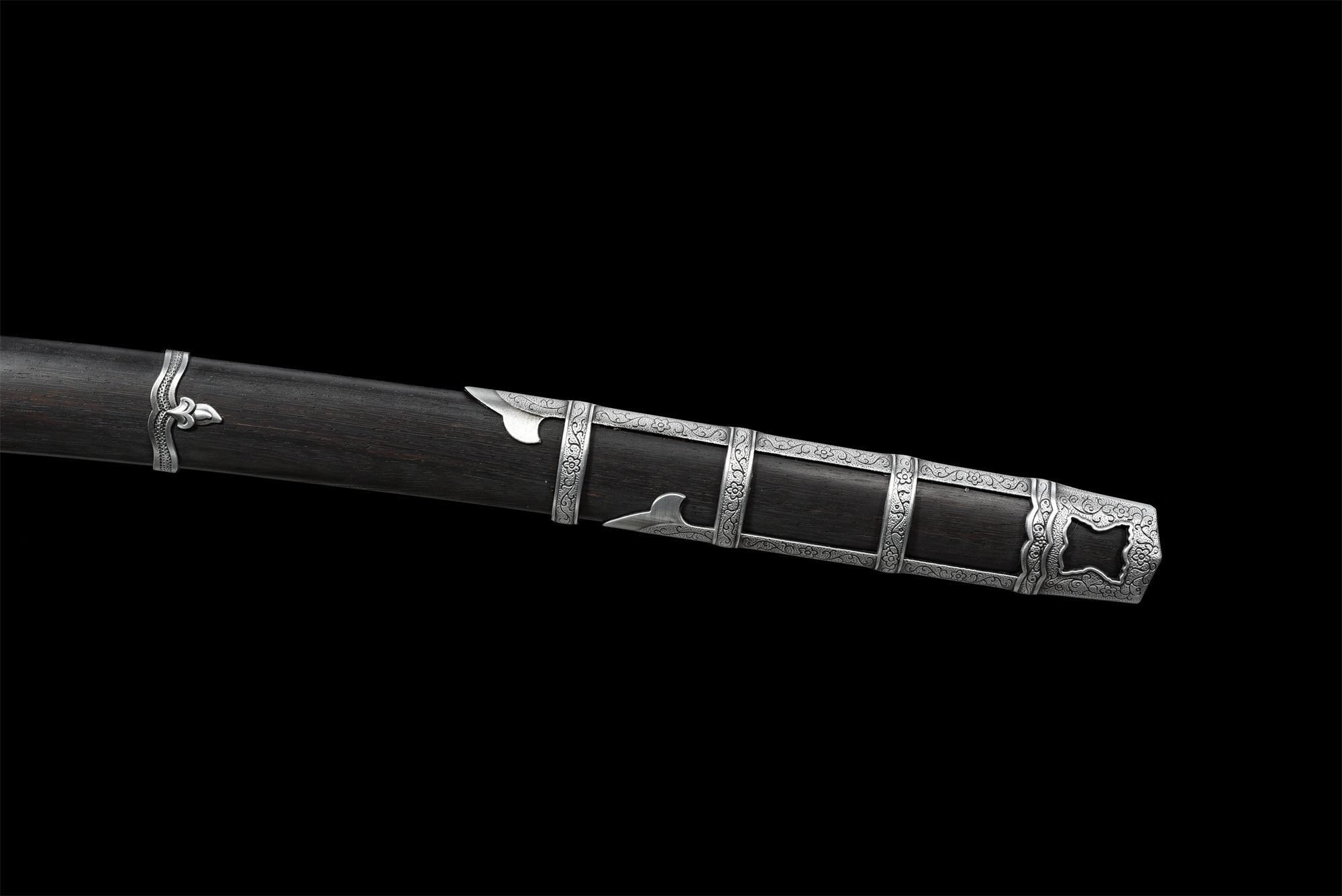 - Scabbard (Saya 鞘): Rosewood scabbard with silver fittings, silver kojiri and koiguchi with engraved flowers.