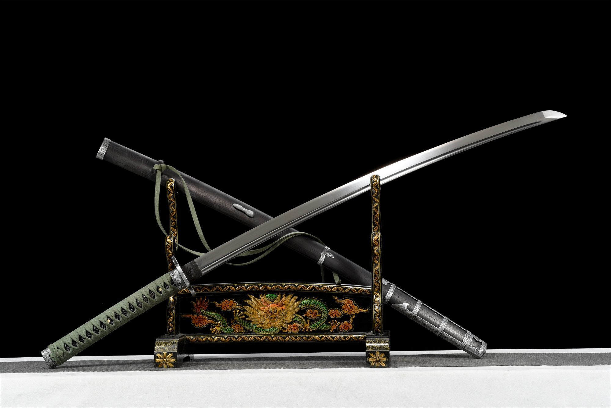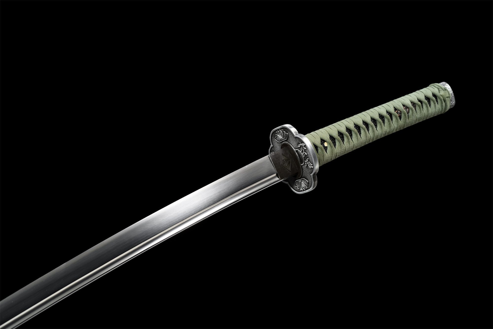 Its manganese steel blade has a polished surface that reveals the subtle nuances of the metal, while the bo-hi lightens the structure and produces a characteristic whistling sound when moved. The rounded cross-shaped tsuba, forged from a silver alloy, features finely engraved floral motifs that contrast with the kozuka-hitsu, showcasing the craftsmanship involved. The handle combines the authentic texture of black stingray skin with fine wood, wrapped in a green tsuka-ito braided in a diamond pattern that ensures a firm grip. The menuki represent a golden dragon, a symbol of power and protection, while the fuchi and kashira harmoniously echo the floral motifs of the guard. The rosewood scabbard, embellished with silver ornaments, ends with a kojiri and koiguchi decorated with engraved flowers, creating a coherent ensemble of striking beauty.