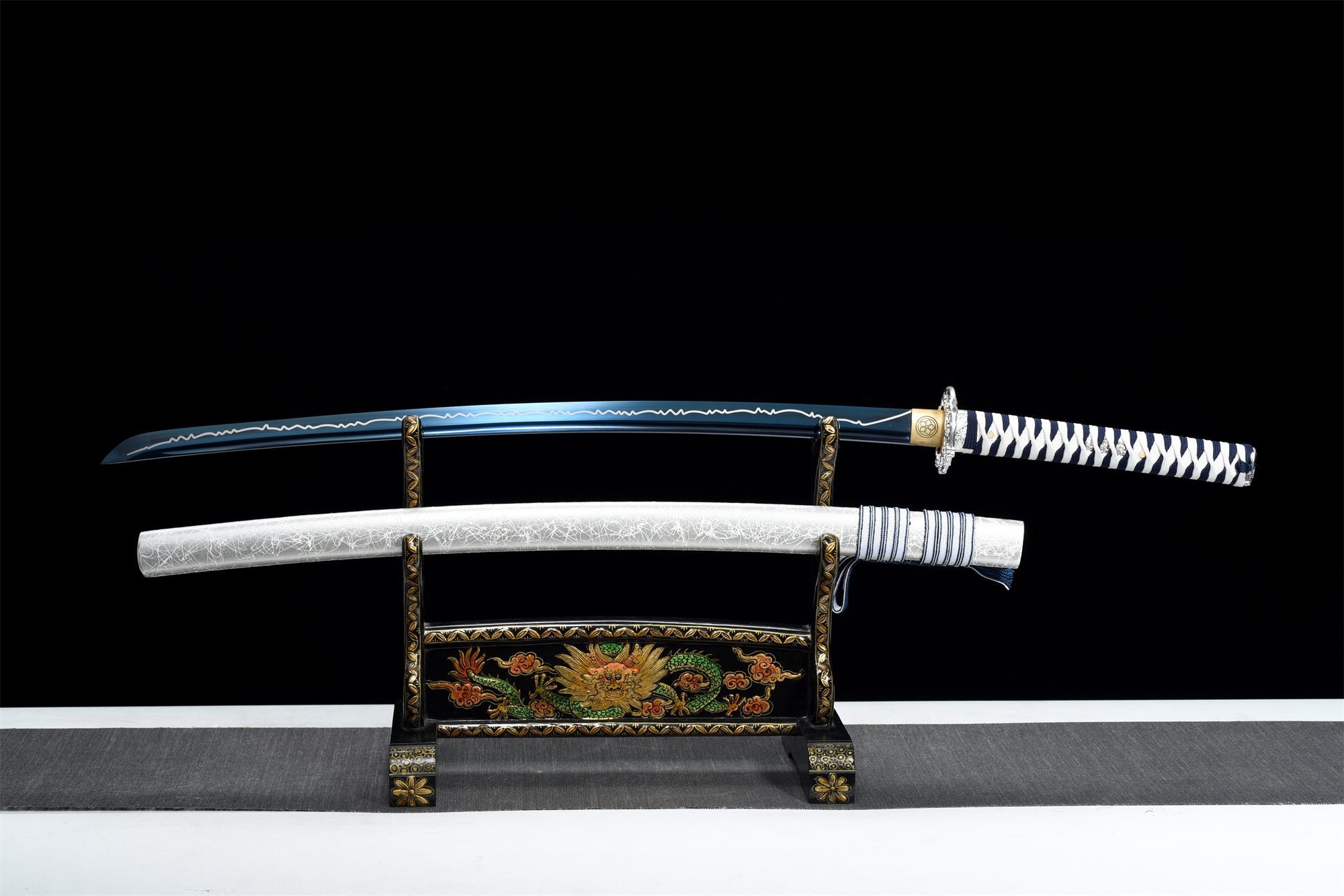 The manganese steel blade has a deep blue hue reminiscent of stormy skies, while its polished surface reflects light with the intensity of a morning bolt of lightning. The silver alloy guard (tsuba) features delicate carved flowers that contrast harmoniously with the overall simplicity of the sword, creating a refined effect of light and shadow. The handle (tsuka) combines solid wood covered with white imitation stingray skin with white and blue braiding (tsuka-ito) that winds elegantly around it, while the menuki representing a silver dragon evoke the mythical power of storms. The gray scabbard (saya) streaked with lightning bolts extends this celestial aesthetic, complemented by a white and blue sageo that recalls storm clouds.