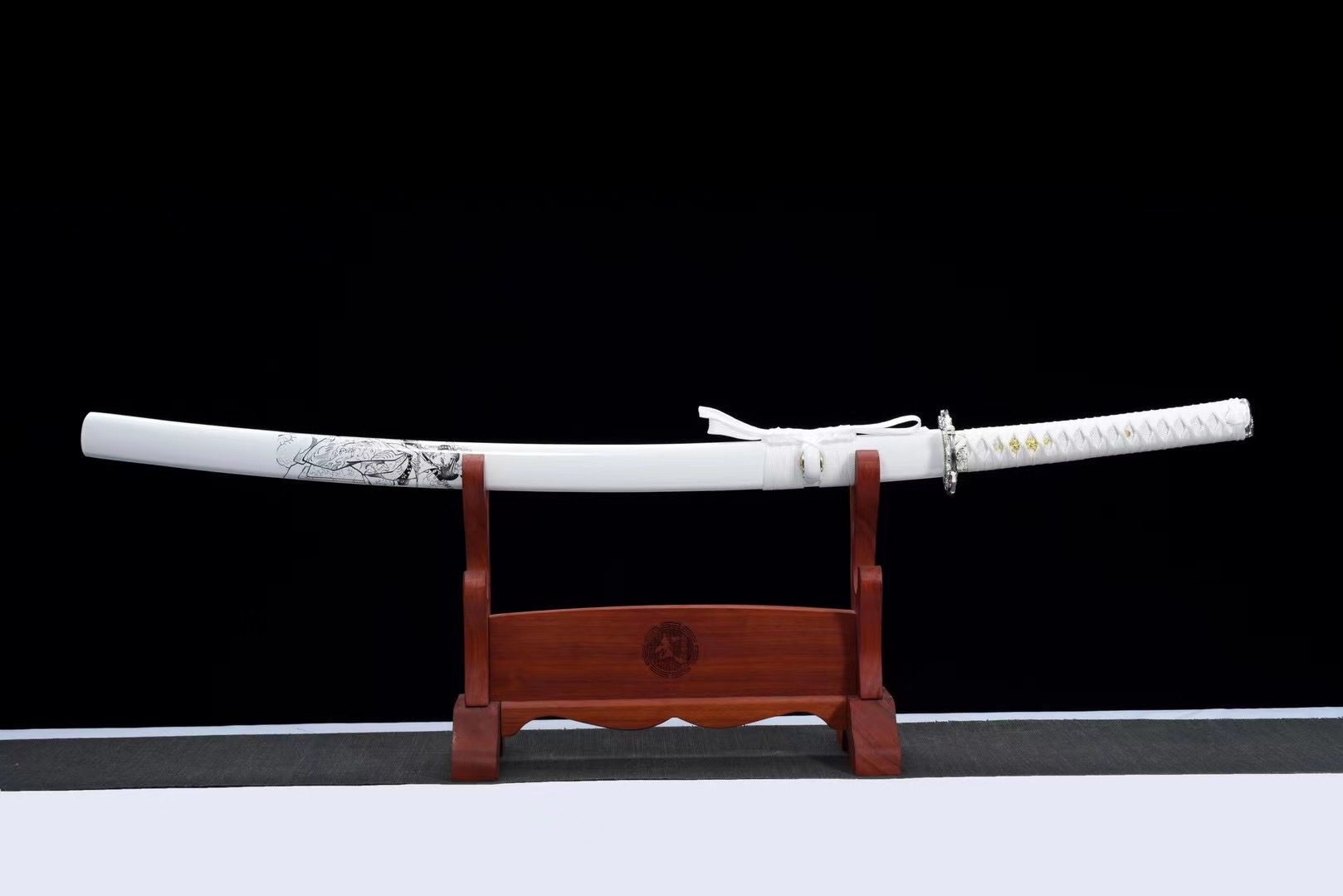 The natural-colored T10 steel blade features a polished finish that reveals the subtle nuances of the metal, while the bo-hi carves an elegant groove that lightens the overall design and produces a characteristic whistling sound when moved. The round silver-plated alloy tsuba features finely chiseled chrysanthemum motifs, symbols of longevity and nobility in Japanese tradition. The handle harmoniously combines white samegawa stingray skin and wood, wrapped in white tsuka-ito braiding with diamond patterns that provide a secure and aesthetic grip. The menuki represent a golden dragon, the mythical guardian of wisdom and strength, while the silver alloy fuchi and kashira are adorned with delicate floral engravings. The white lacquered scabbard provides an exceptional canvas for paintings depicting noble Japanese women in traditional costume, creating an ensemble of rare visual sophistication.
