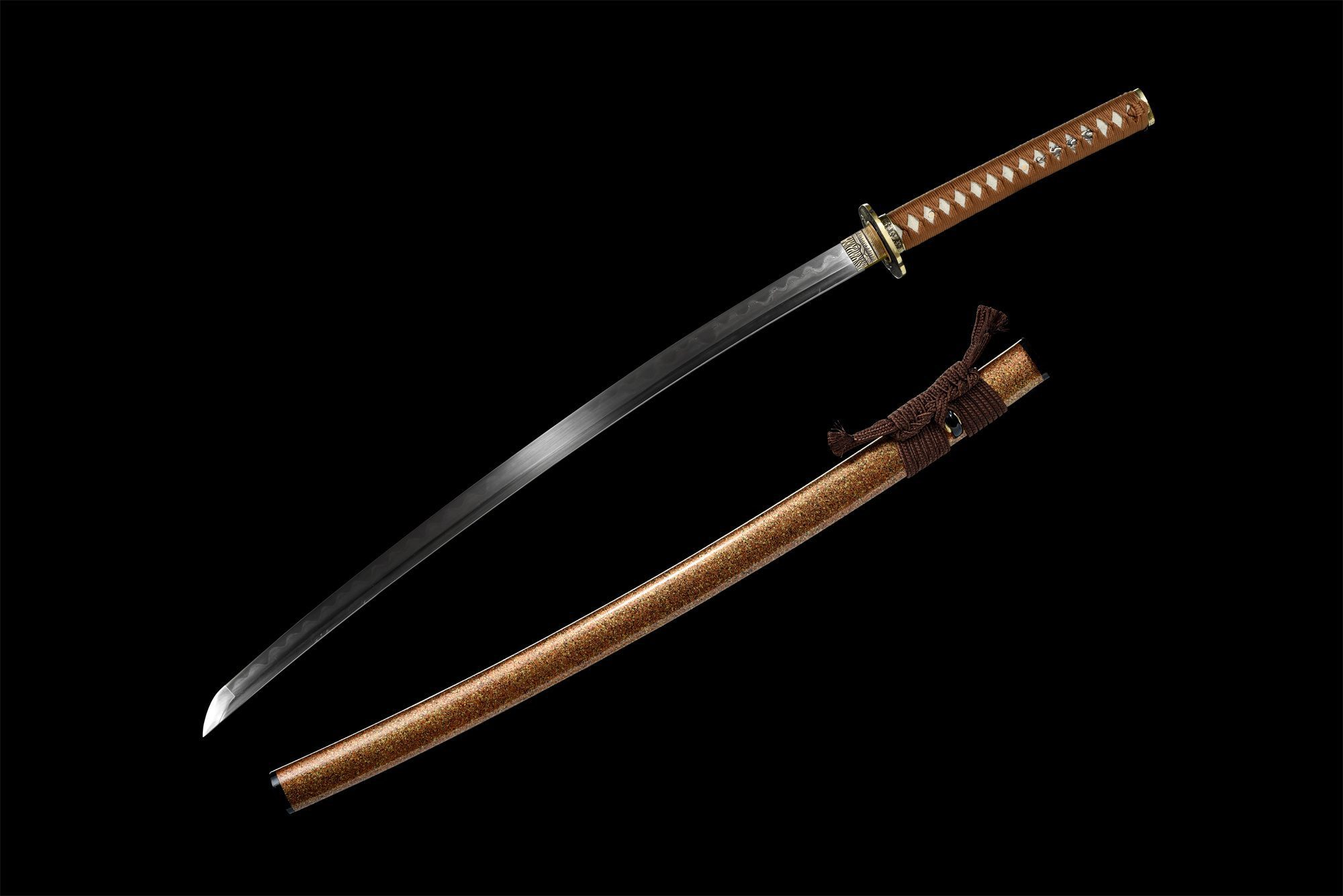 - Scabbard (Saya 鞘): Lacquered and sandblasted wood in orange tones, with black Kojiri and Koiguchi.