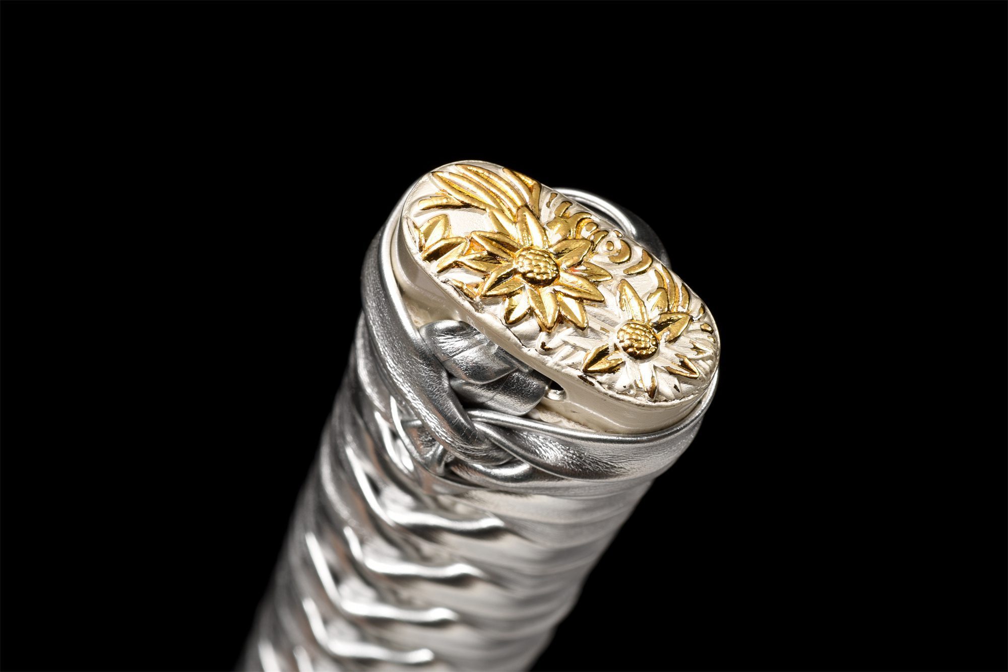 - Kashira (頭): Silver alloy with gilded finishes and floral motifs.