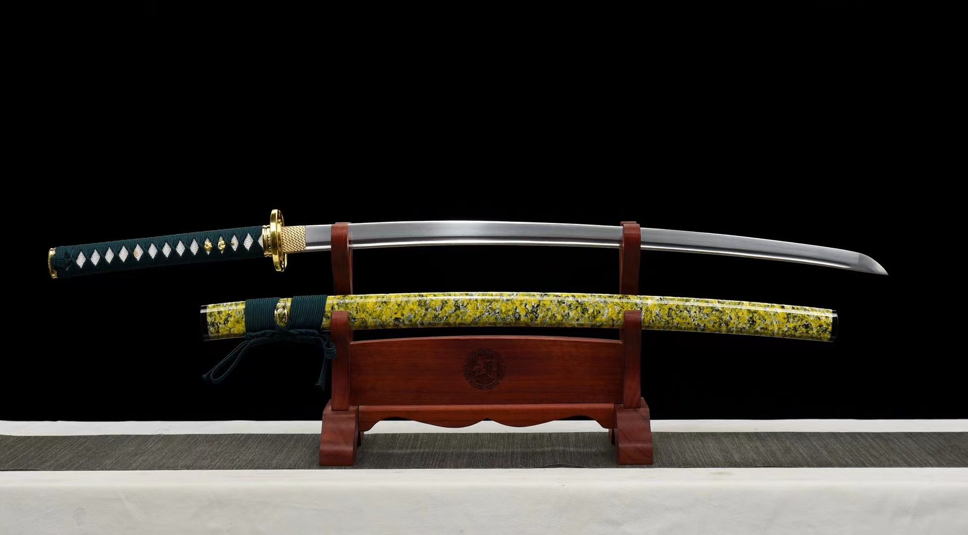 - Tsuka-ITO (柄糸): green diamond pattern weave above the handle.