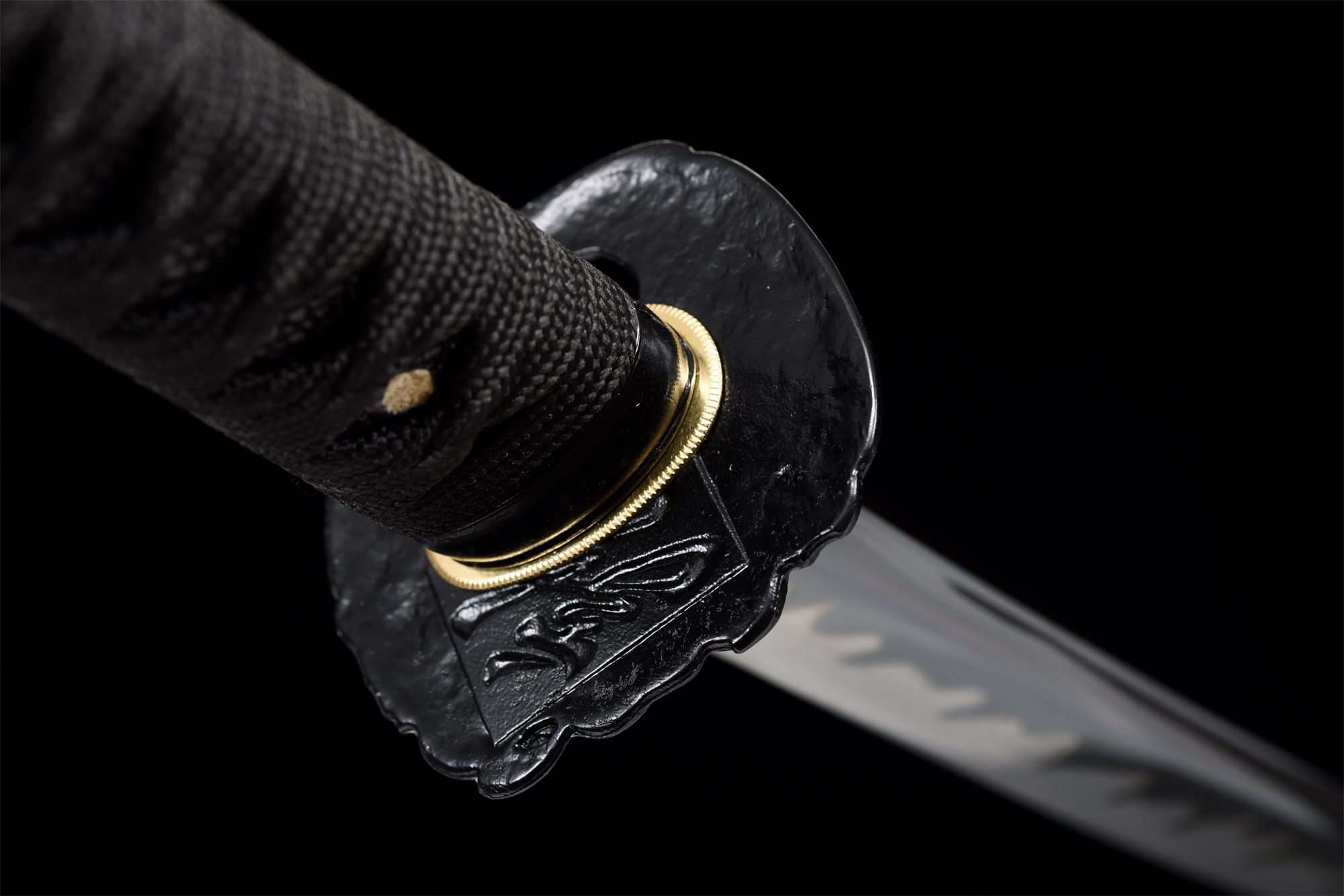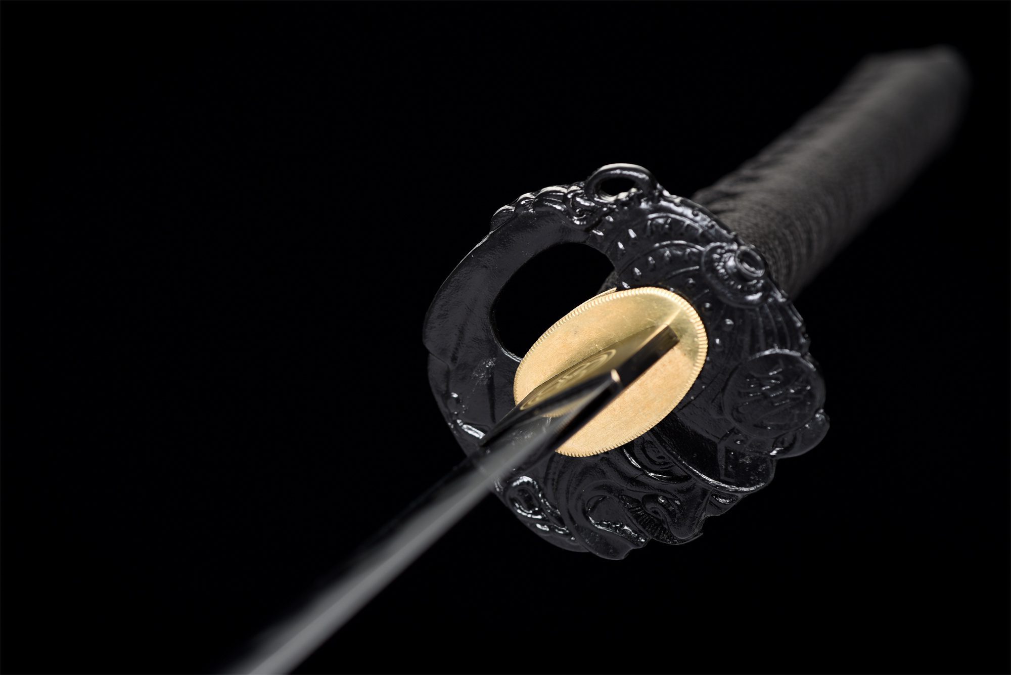 - Guard (Tsuba 鍔): Round guard in engraved black alloy.