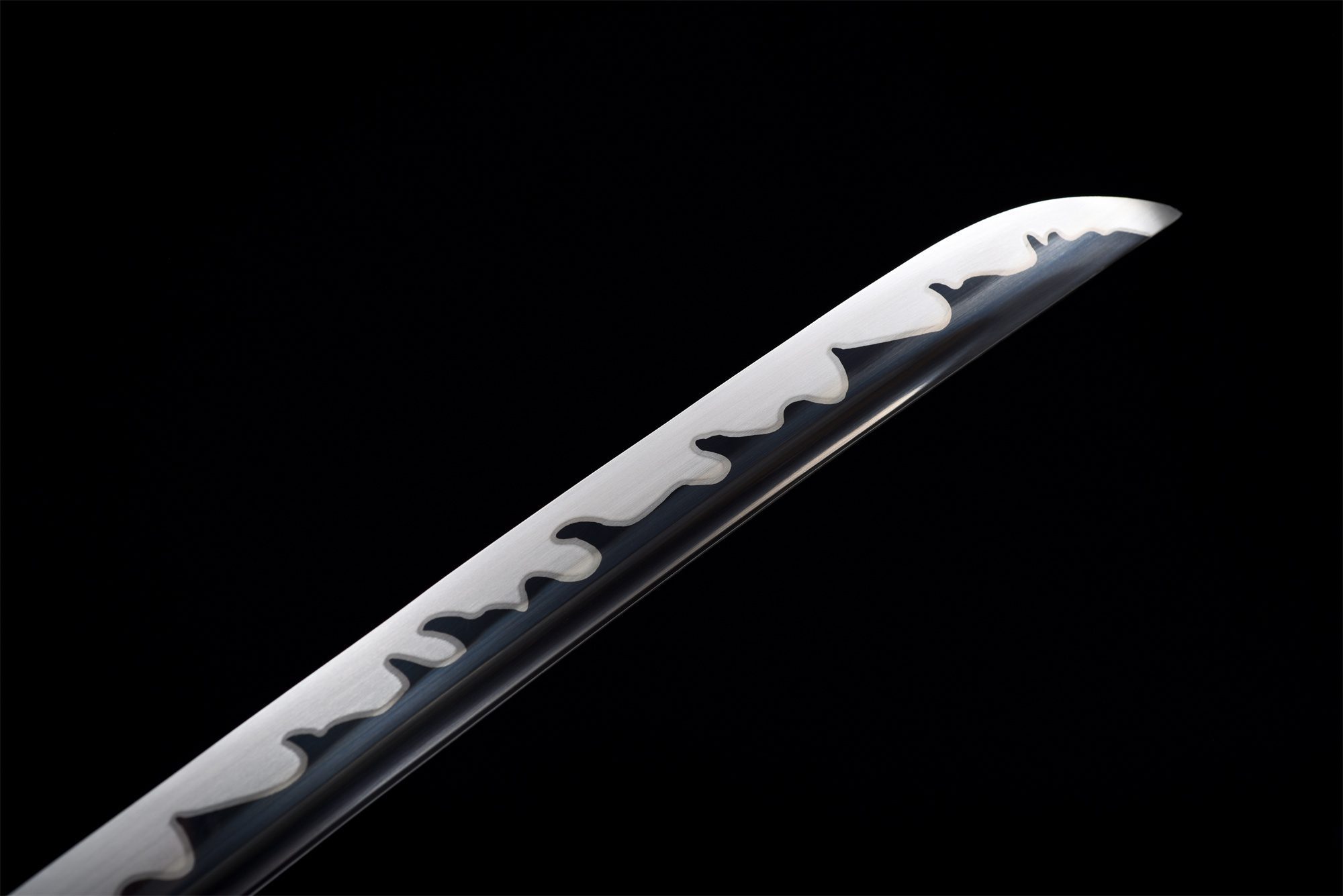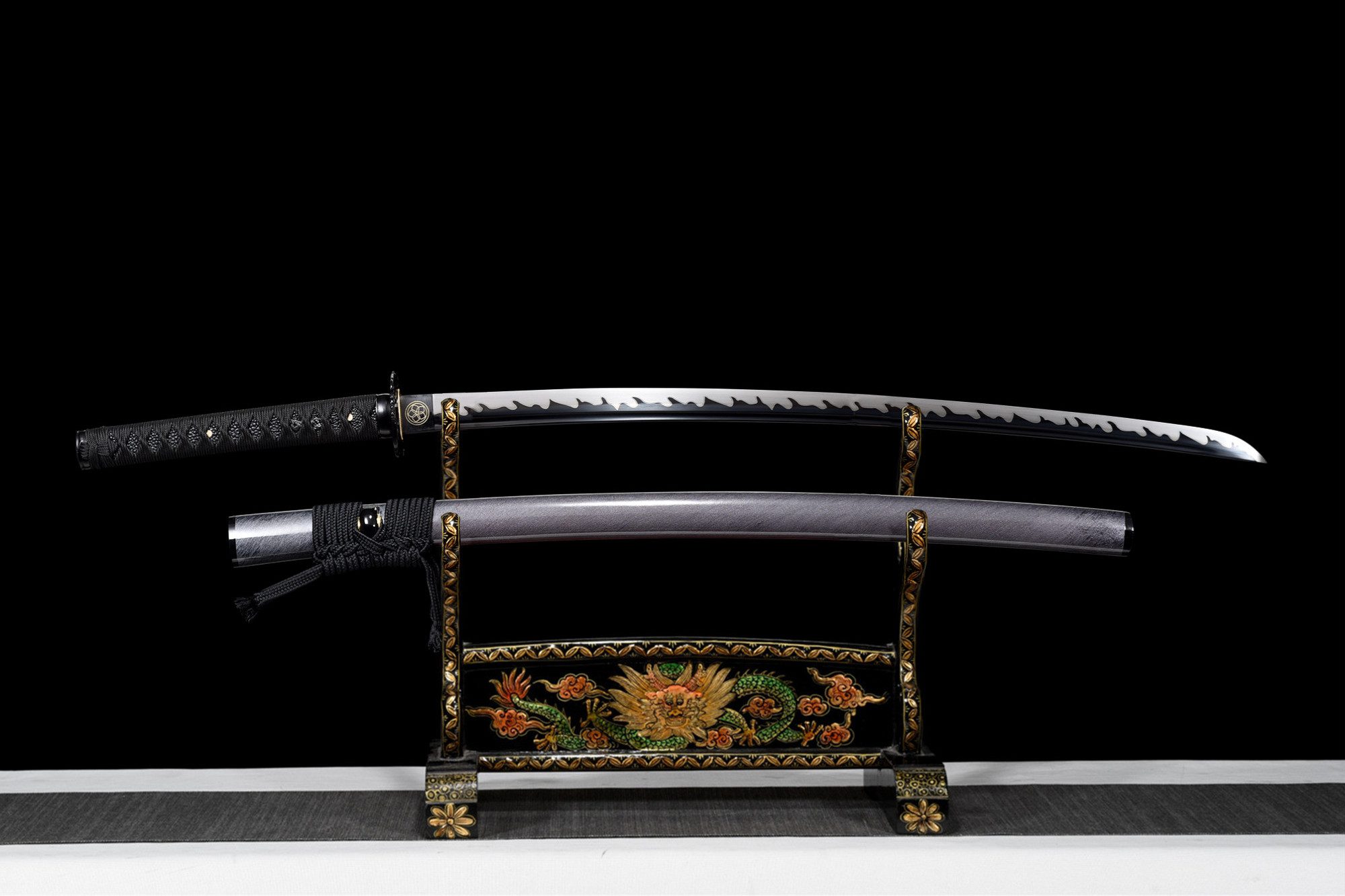 Its manganese steel blade features a striking two-tone finish where pearly white subtly blends with deep black, creating a captivating visual effect enhanced by the midare gunome hamon that undulates along the edge. The bo-hi carved into the blade lightens the overall design while producing a characteristic whistling sound during movement. The round black alloy tsuba features delicate engravings that complement the monochrome aesthetic, while the smooth black alloy fuchi and kashira elegantly frame the handle. The tsuka combines faux black stingray skin with black tsuka-ito braiding in a diamond pattern, adorned with menuki representing black dragons, symbols of power. The black and white lacquered wooden saya with a brushed effect offers a striking contrast, its black ends (kojiri and koiguchi) unifying the whole, complemented by a traditional black sageo.