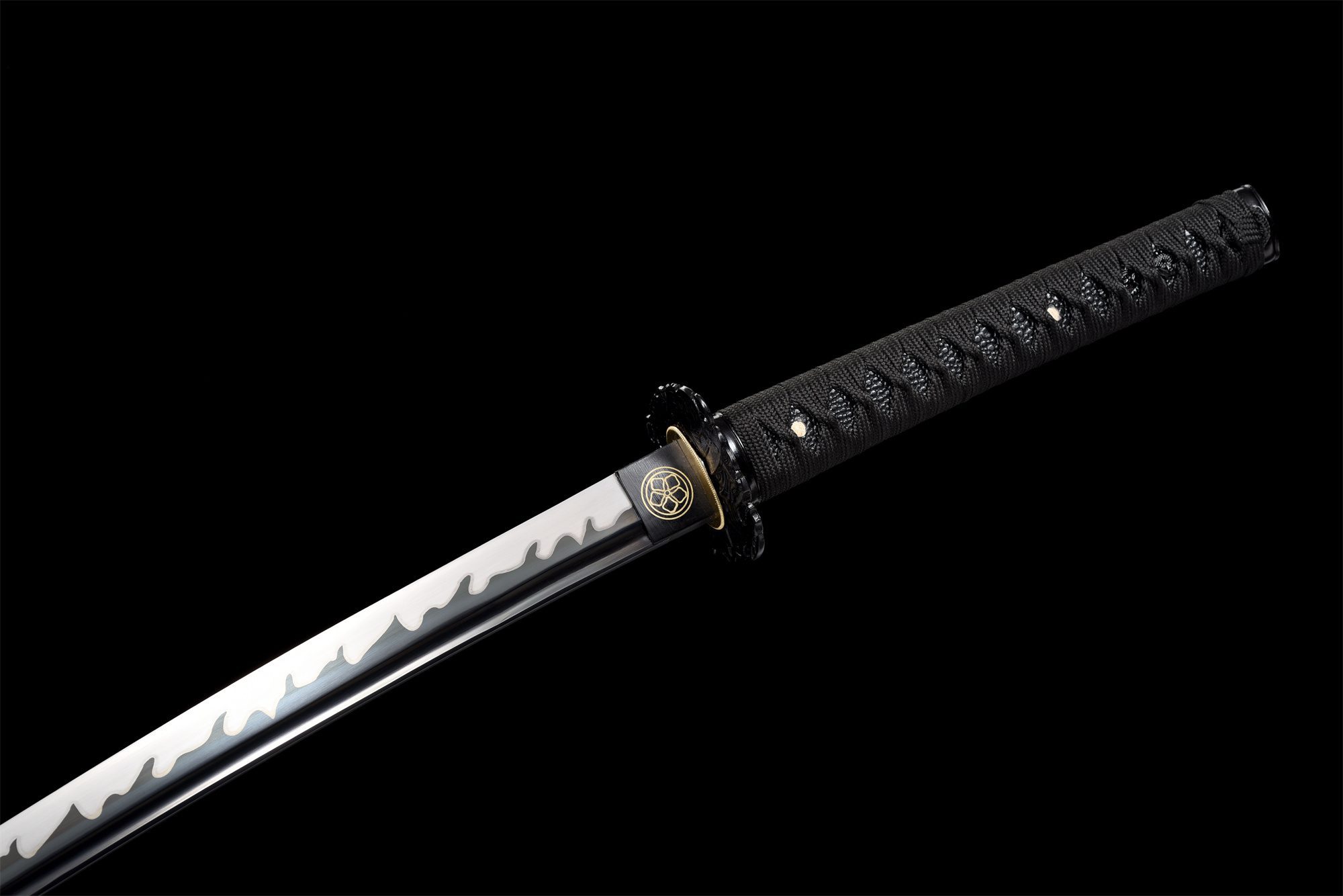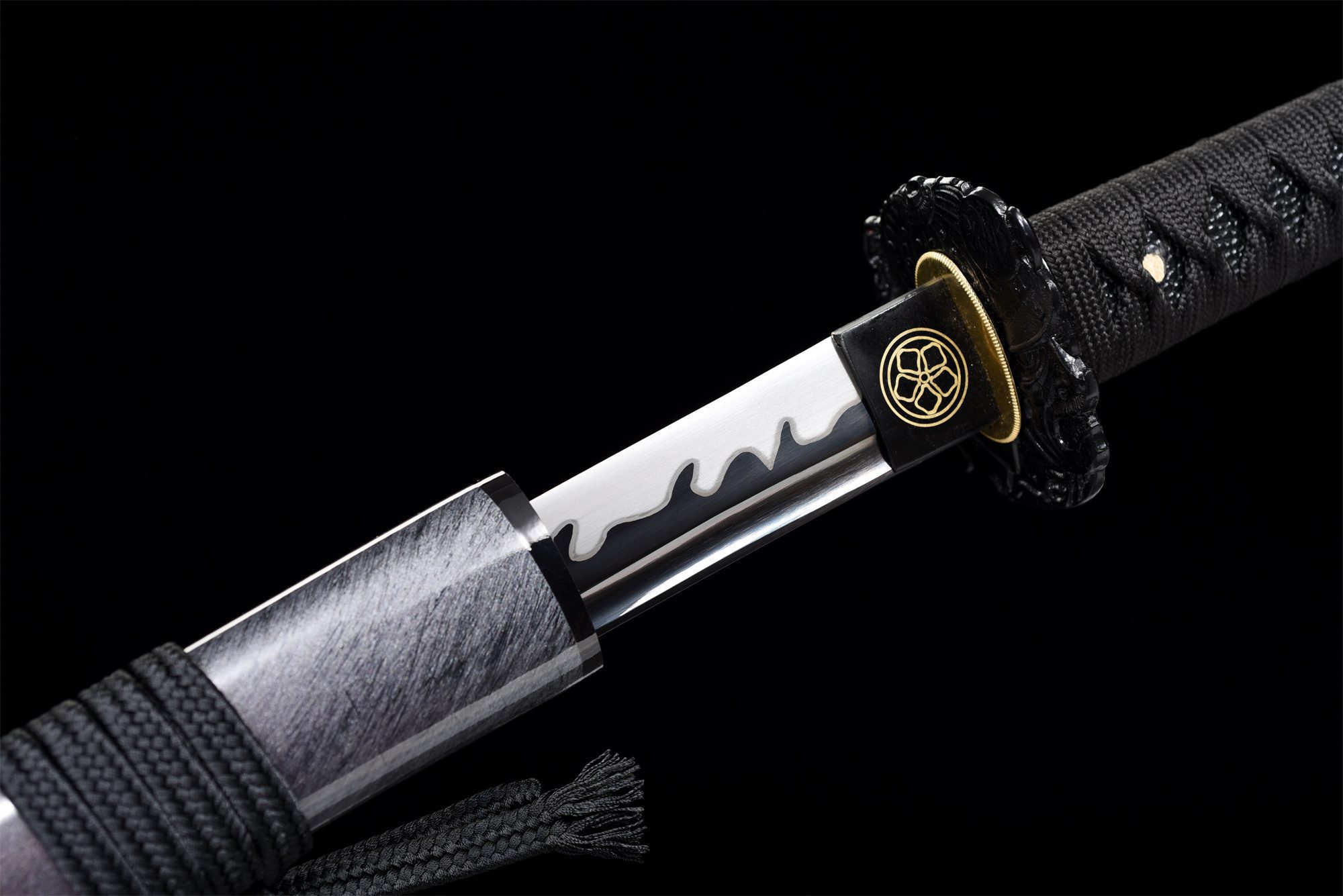 - Scabbard (Saya 鞘): White and black lacquered wood with a brushed effect, black kojiri and koiguchi.