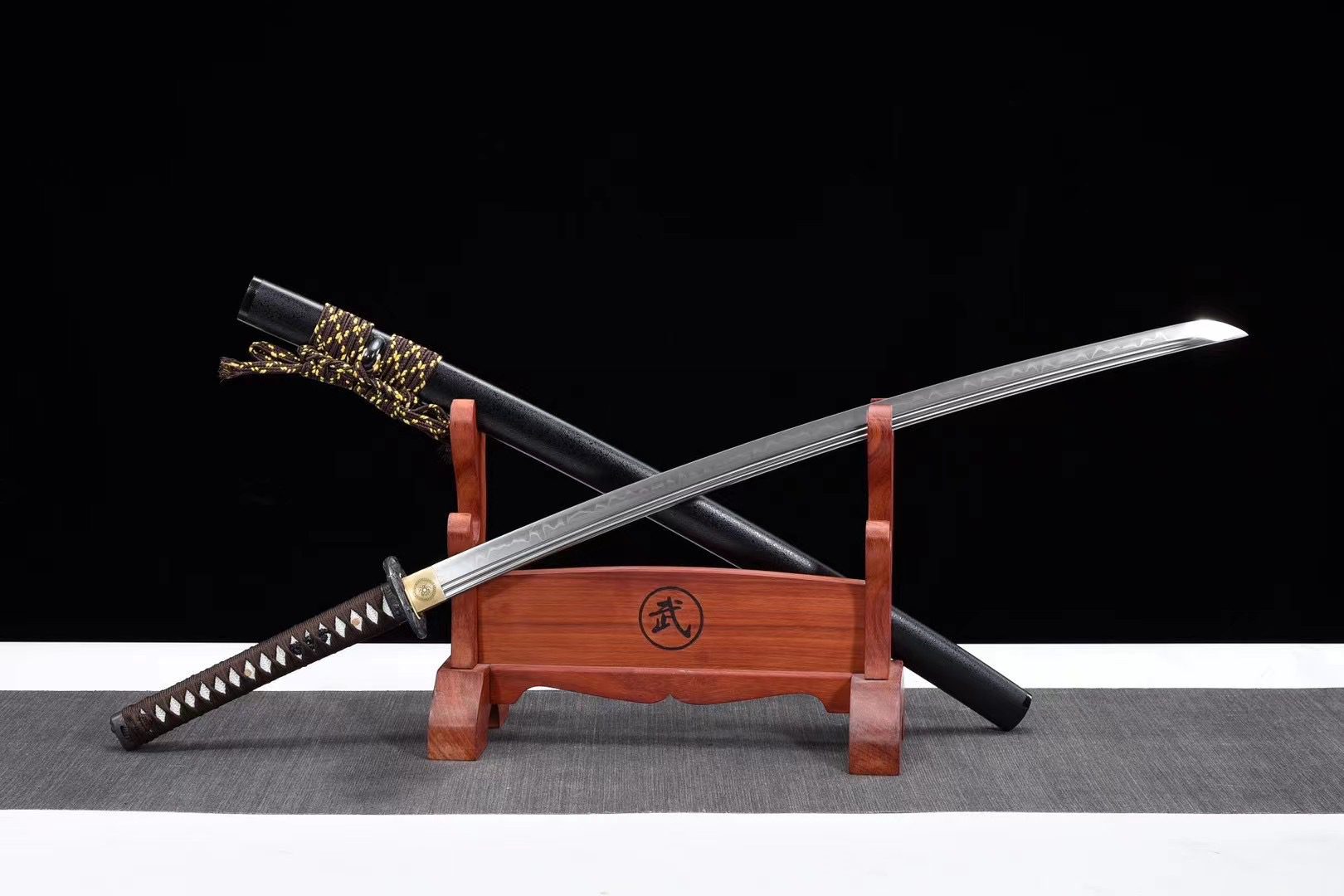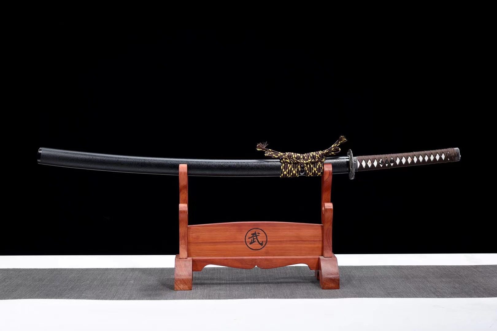 - Scabbard (Saya 鞘): black grainy lacquered wooden scabbard with black kojiri and koiguchi.
