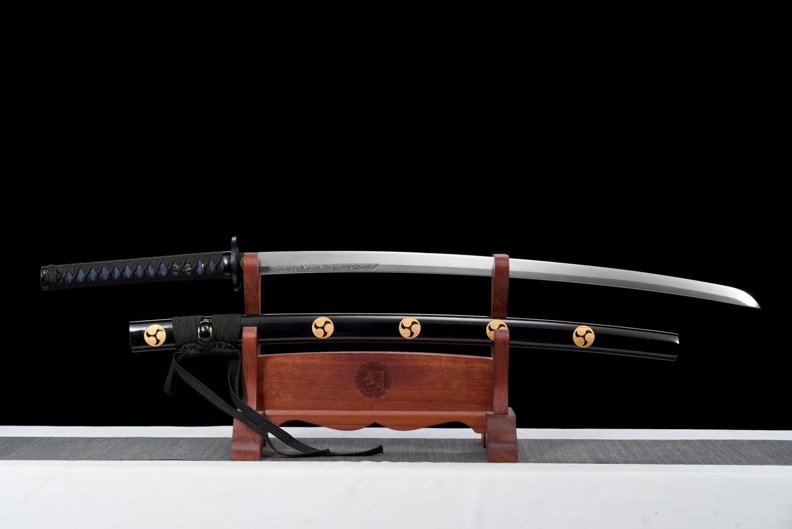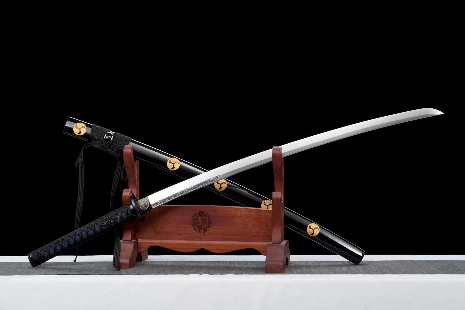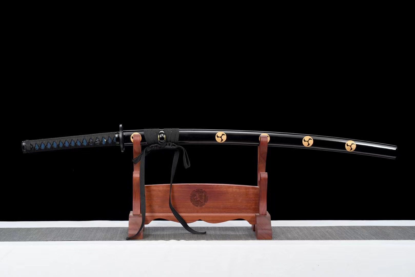 - Scabbard (Saya 鞘): black lacquered wooden scabbard with black shuriken-shaped kamon, black ends (Kojiri and Koiguchi).
