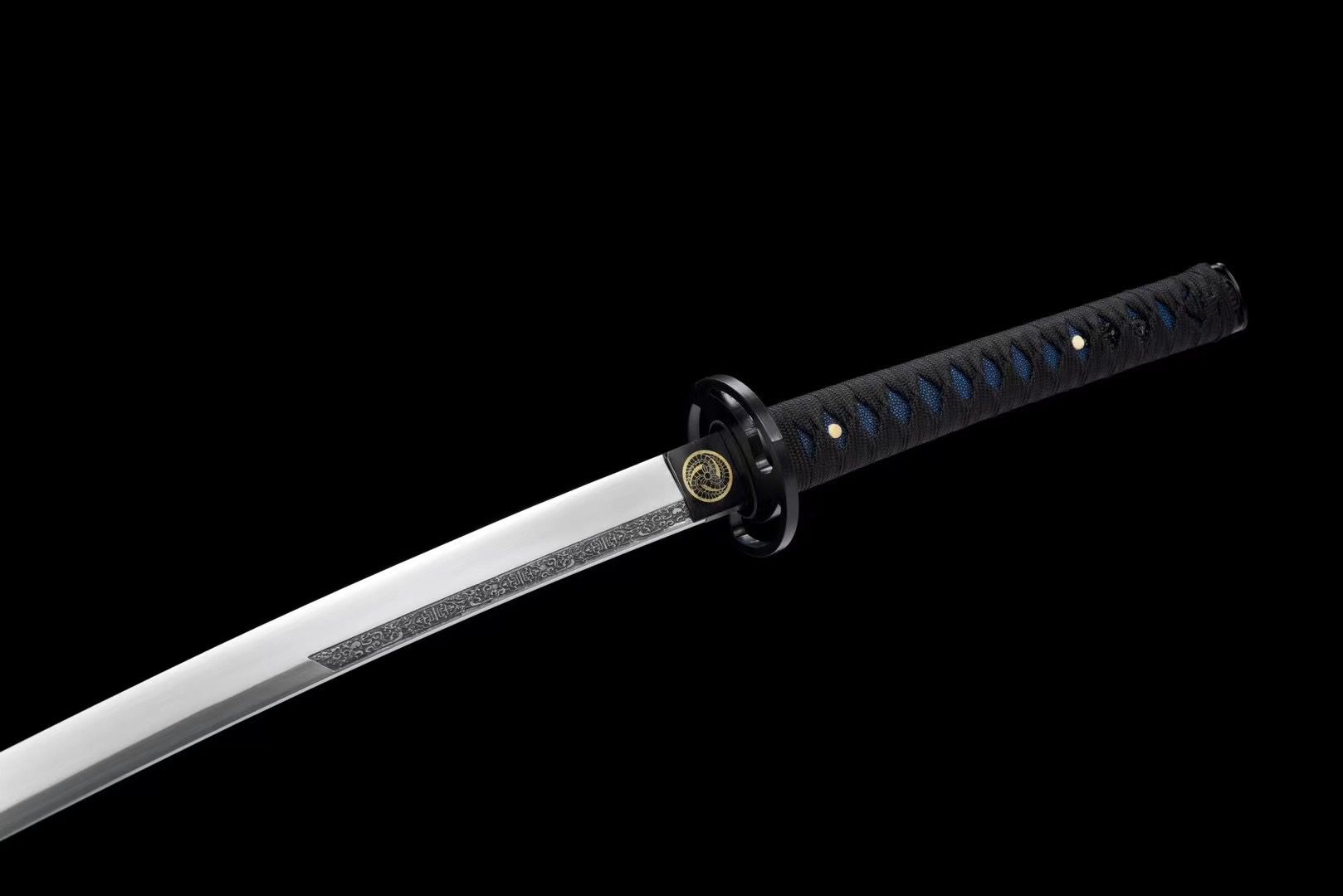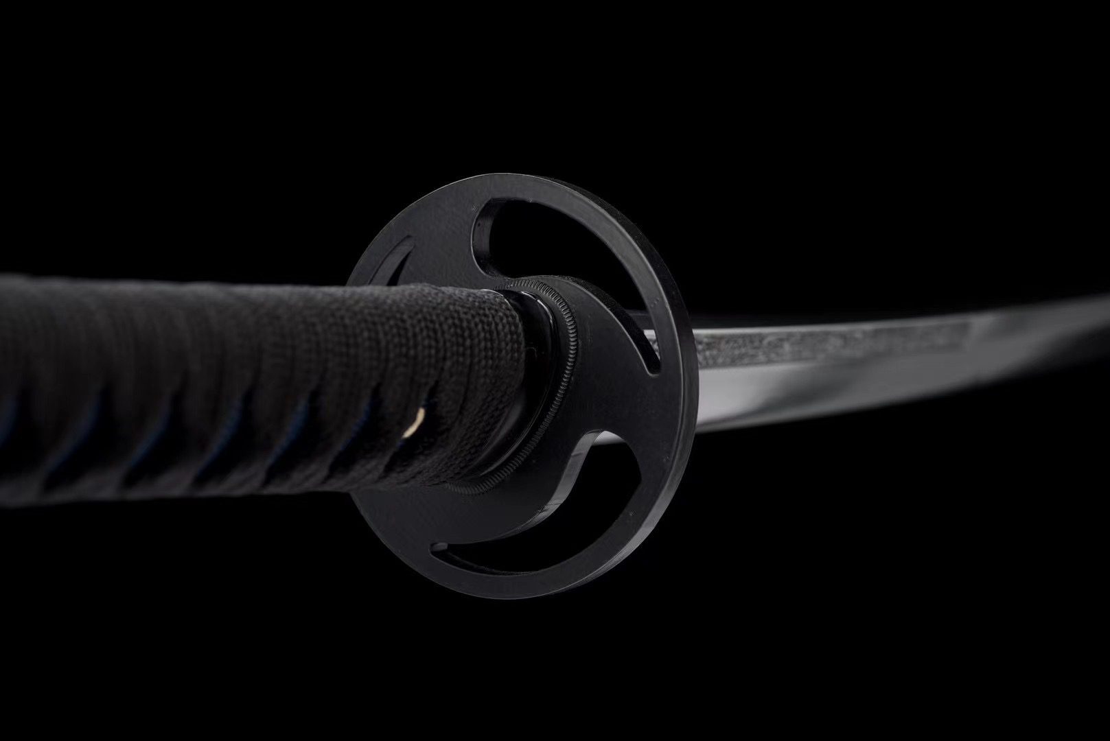 The T10 steel blade has a natural finish that reveals the raw beauty of forged metal, while the round black alloy guard (tsuba) evokes the shape of a shuriken. The handle (tsuka) harmoniously combines midnight blue faux stingray skin with black braiding (tsuka-ito) in a diamond pattern, providing a firm and elegant grip. The menuki represent a black dragon, symbolizing power and wisdom, while the black alloy fuchi and kashira complete the ensemble with their smooth and refined finish. The black habaki also bears a swirling kamon evoking the shuriken. The black lacquered wooden scabbard (saya) is decorated with black shuriken-shaped kamon, and its ends (kojiri and koiguchi) echo this deep hue, accompanied by a discreet black sageo.