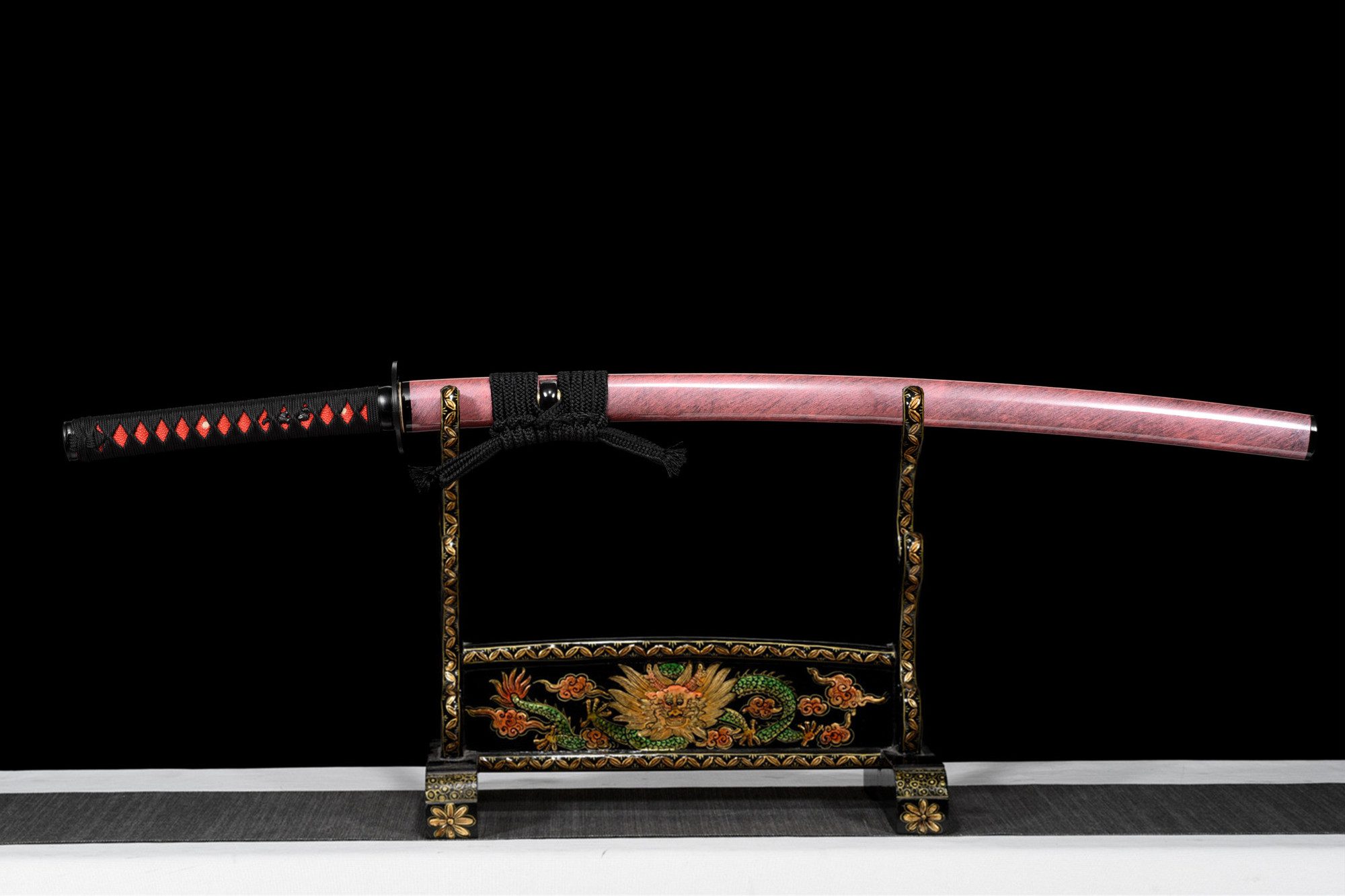 - Scabbard (Saya 鞘): Pink and black lacquered wood with a brushed effect, black ends (Kojiri and Koiguchi).