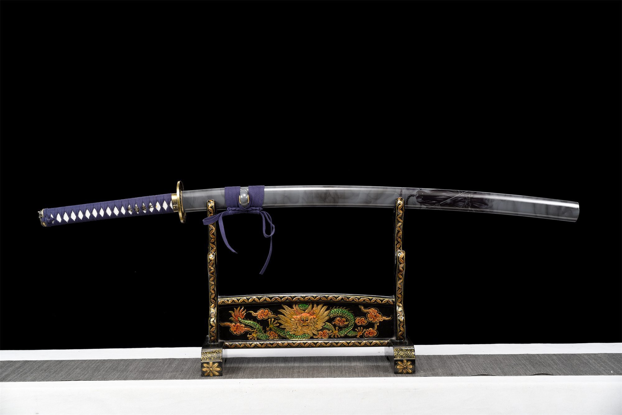 Its 1060 steel blade features a deep black hue that contrasts beautifully with the genuine notare hamon achieved through differential tempering. The bo-hi carved into the blade produces a characteristic whistling sound during movement while lightening the overall weight. The round gilded tsuba features a striking demon head in relief, while the fuchi echoes this demonic motif with remarkable finesse. The handle combines traditional faux white stingray skin with blue tsuka-ito braiding in a diamond pattern, creating an elegant visual contrast. The gilded menuki harmoniously complete the whole, and the gilded kashira is adorned with wave and wind motifs that evoke the forces of nature unleashed. The gray and black lacquered wooden scabbard represents the Grim Reaper, reinforcing the dark and mysterious aesthetic of this item, complemented by a blue sageo that adds a subtle touch of color.