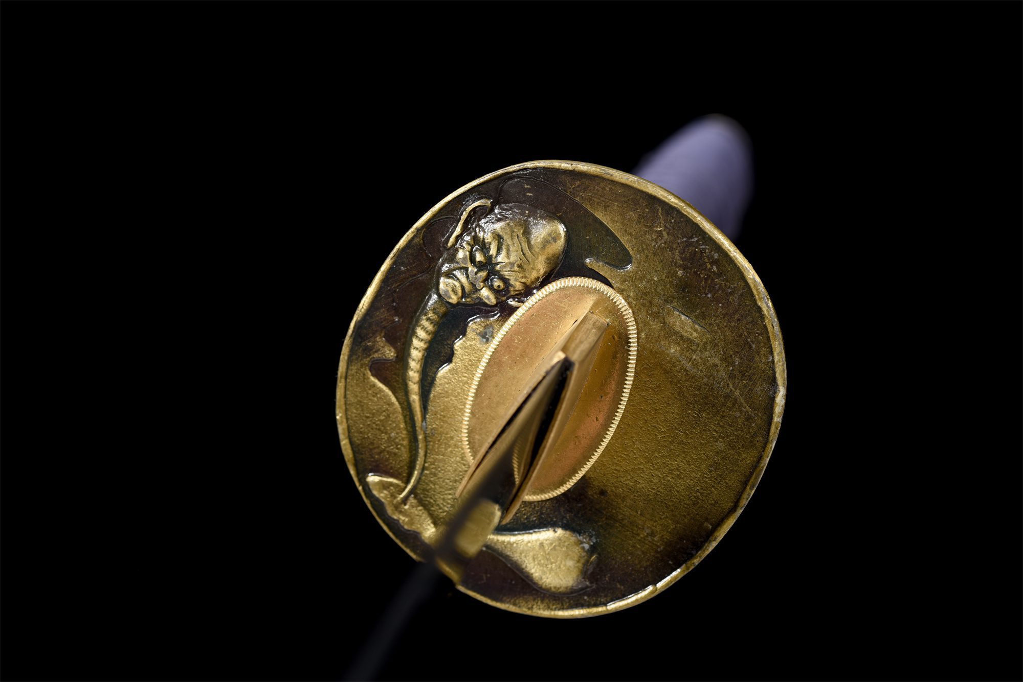 - Guard (Tsuba 鍔): Round and gilded with a demon head in relief.