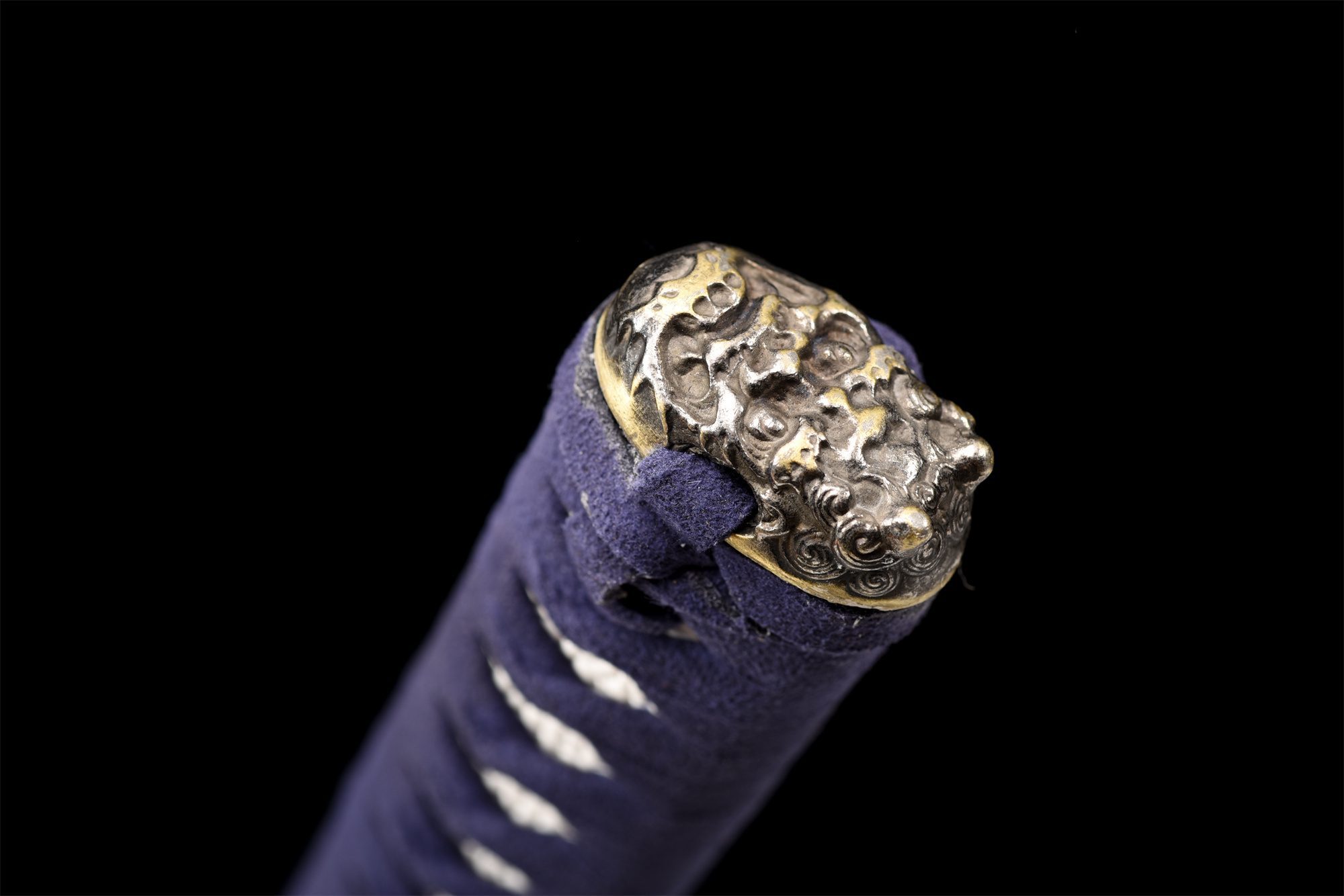 - Tsuka-ITO (柄糸): Blue braided in a diamond pattern above the handle.