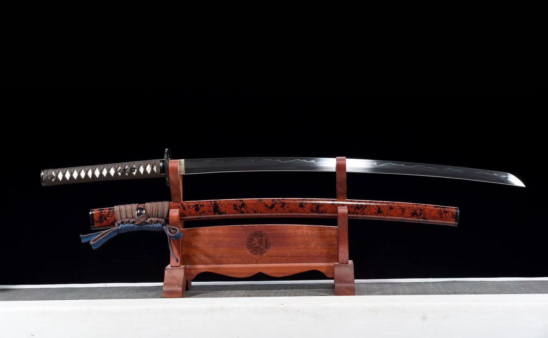 Its T10 steel blade reveals its natural beauty through an authentic gunome hamon obtained by differential tempering, creating undulating patterns reminiscent of the cloud formations evoked by its name. The brushed brass habaki contrasts elegantly with the round black alloy tsuba with hollow shapes, offering a striking visual balance. The handle combines tradition with its white faux stingray base and brown tsuka-ito braiding in a diamond pattern, while the menuki represent a black dragon, symbolizing power and wisdom. The smooth black alloy fuchi and kashira harmoniously complete the ensemble. The black and red lacquered wooden scabbard creates a dramatic contrast, enhanced by the brown and blue sageo that evokes the changing hues of the sky.