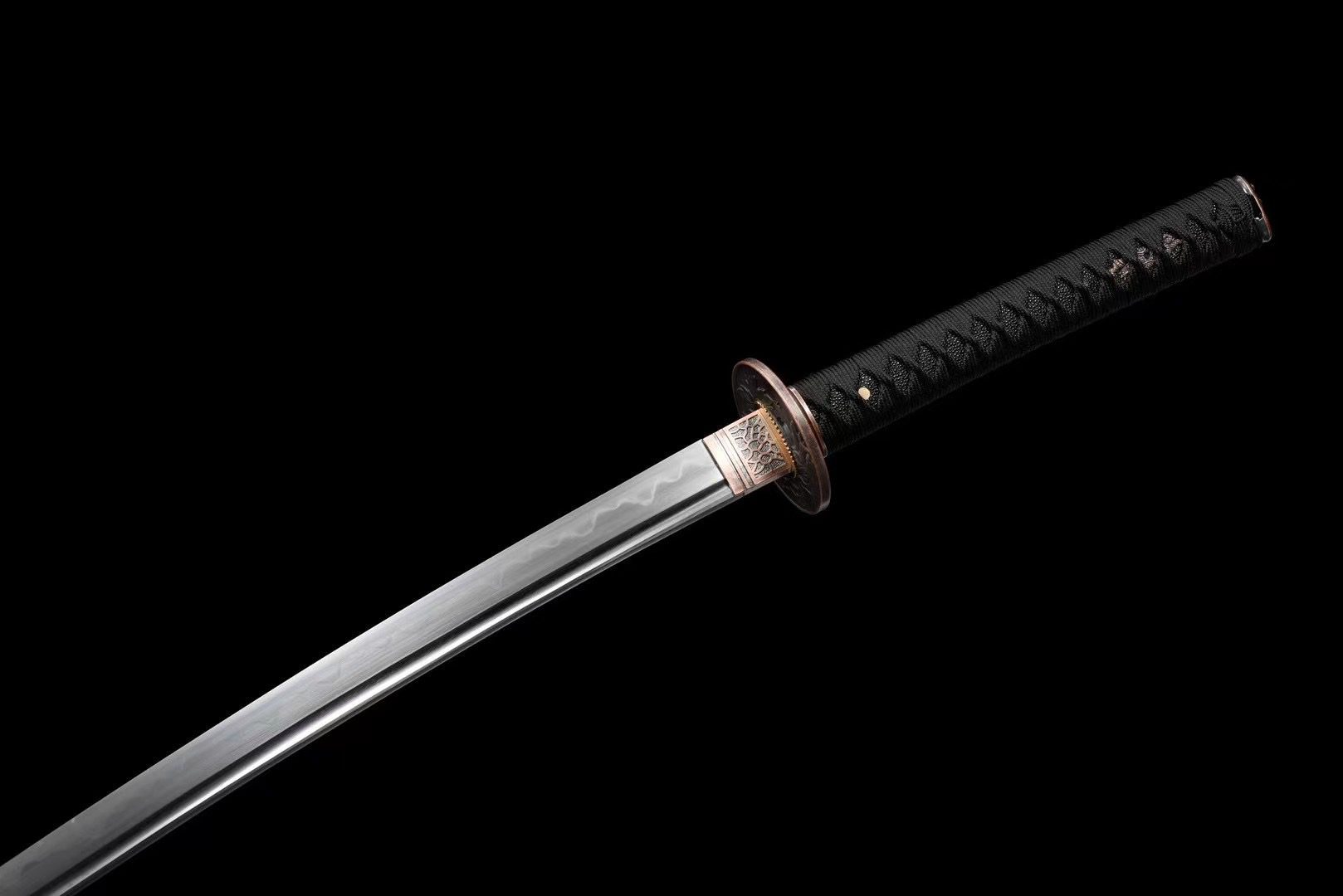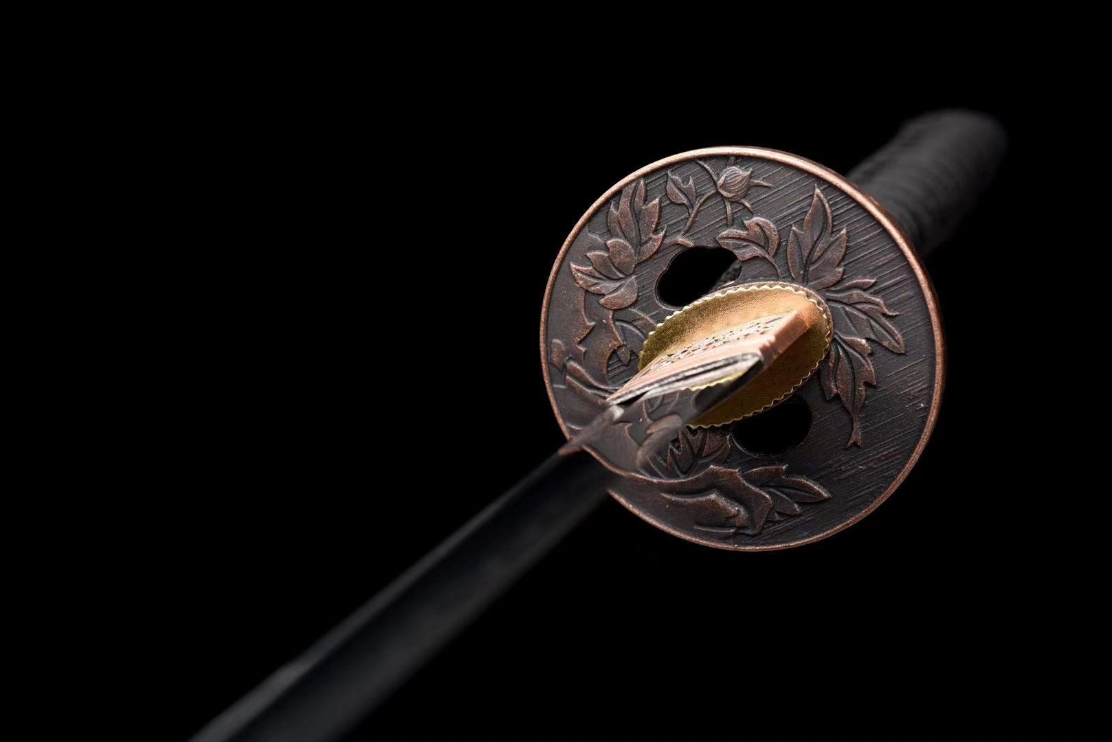 - Guard (Tsuba 鍔): beautiful round guard in brushed copper engraved with flowers.