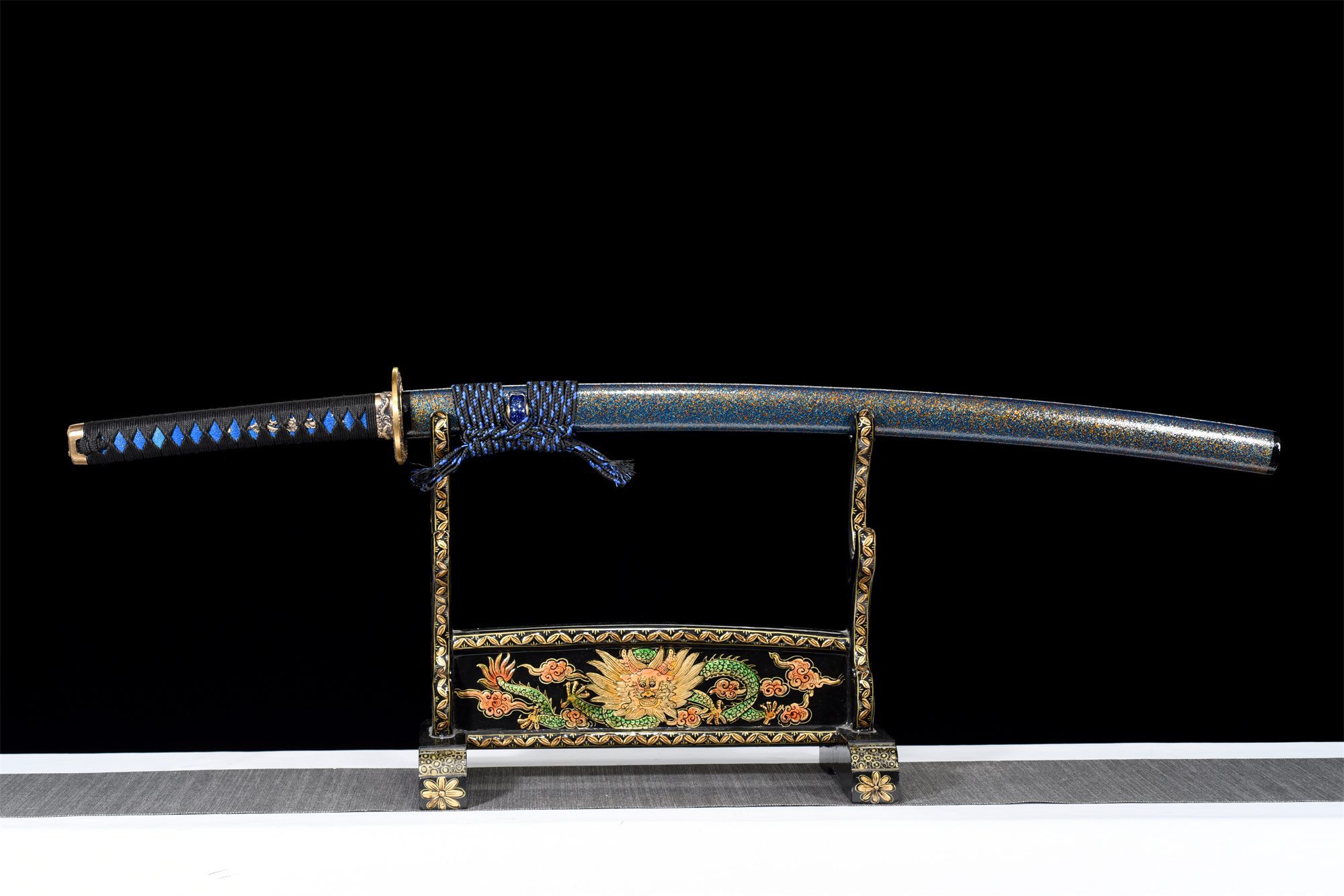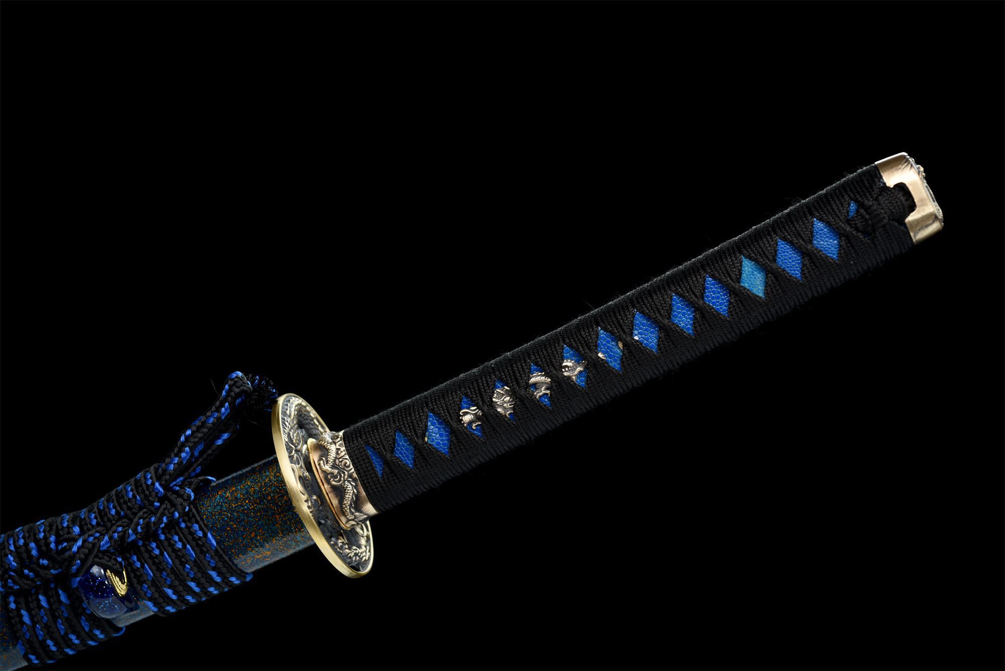 Its T10 steel blade reveals an authentic midare hamon with dancing flames, created by traditional differential tempering, which gives the steel its legendary strength. The rounded brass tsuba features a finely chiseled dragon, a symbol of Eastern power and wisdom. The handle harmoniously combines authentic stingray skin and hardwood, wrapped in black diamond-patterned braiding that ensures a firm and elegant grip. The golden menuki represent dragons, while the fuchi echoes this dragon motif and the kashira features symbols of waves and wind. The blue scabbard with orange grainy highlights evokes the changing hues of the twilight sky, complemented by a genuine horn koiguchi and a two-tone blue and black sageo.