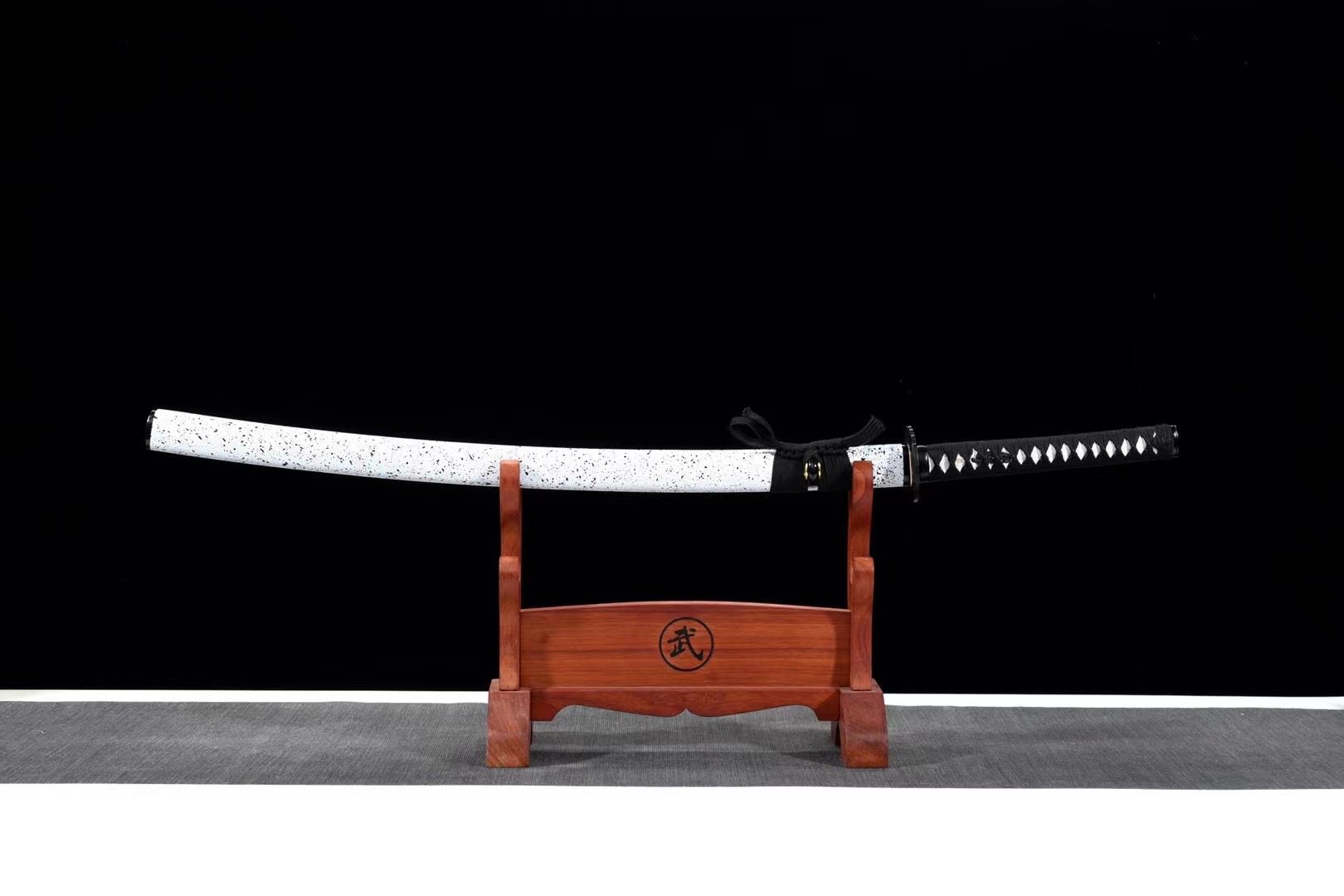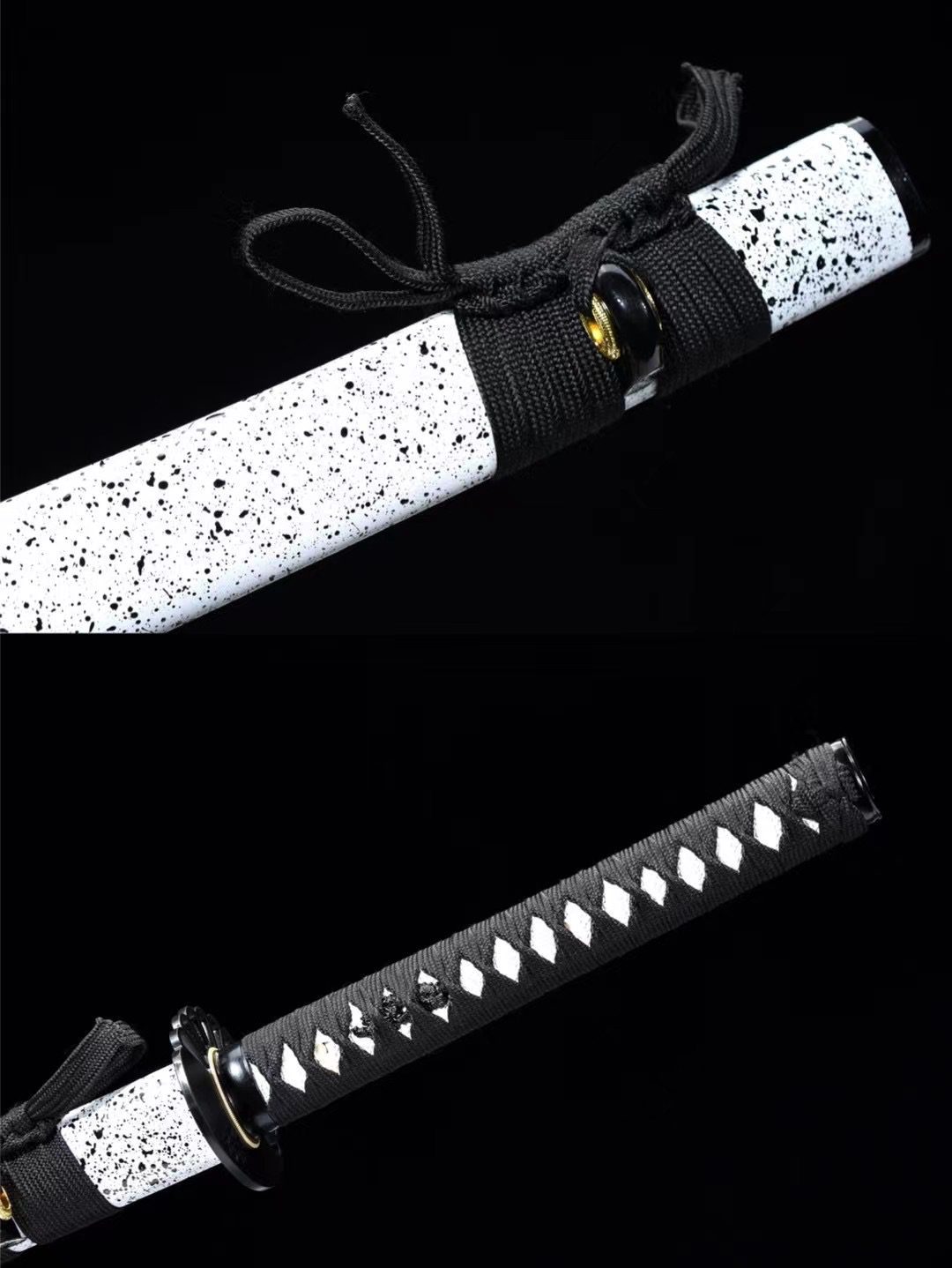 - Scabbard (Saya 鞘): white lacquered wood with black dots, black ends (Kojiri and Koiguchi).