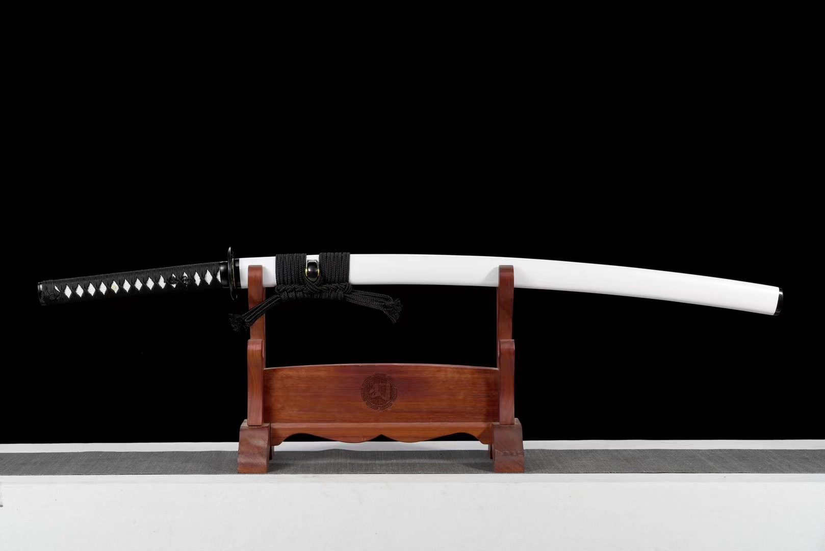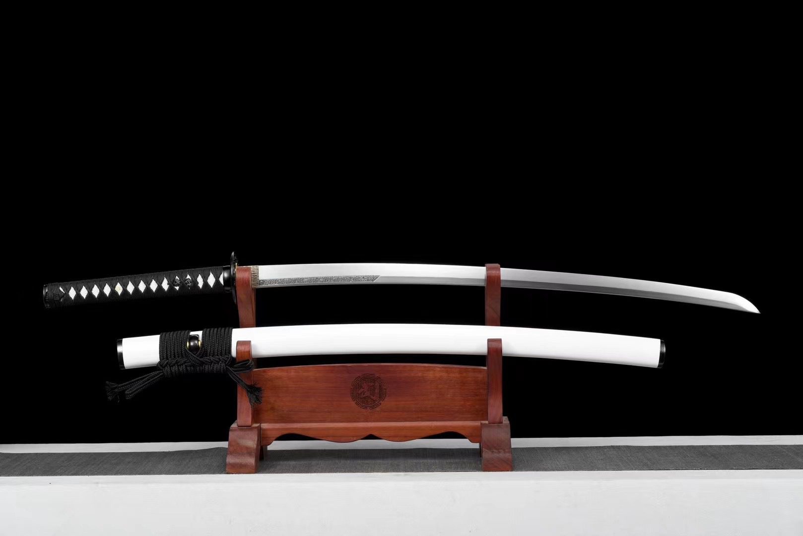 The T10 steel blade features a natural finish that reveals the raw beauty of forged metal, contrasting harmoniously with the finely engraved copper habaki that ensures a perfect fit in the scabbard. The round black alloy tsuba features delicately carved floral motifs that elegantly filter the light. The handle combines the authentic texture of white faux stingray skin with black diamond-patterned braiding, creating a striking visual balance enhanced by carved menuki depicting black dragons. The immaculate white lacquered wooden scabbard is adorned with black accents at the kojiri and koiguchi, recalling the harmony of opposites embodied in the very name of this blade.