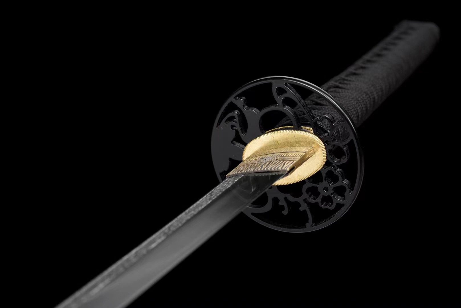 - Guard (Tsuba 鍔): Black alloy round guard, decorated with carved floral motifs.