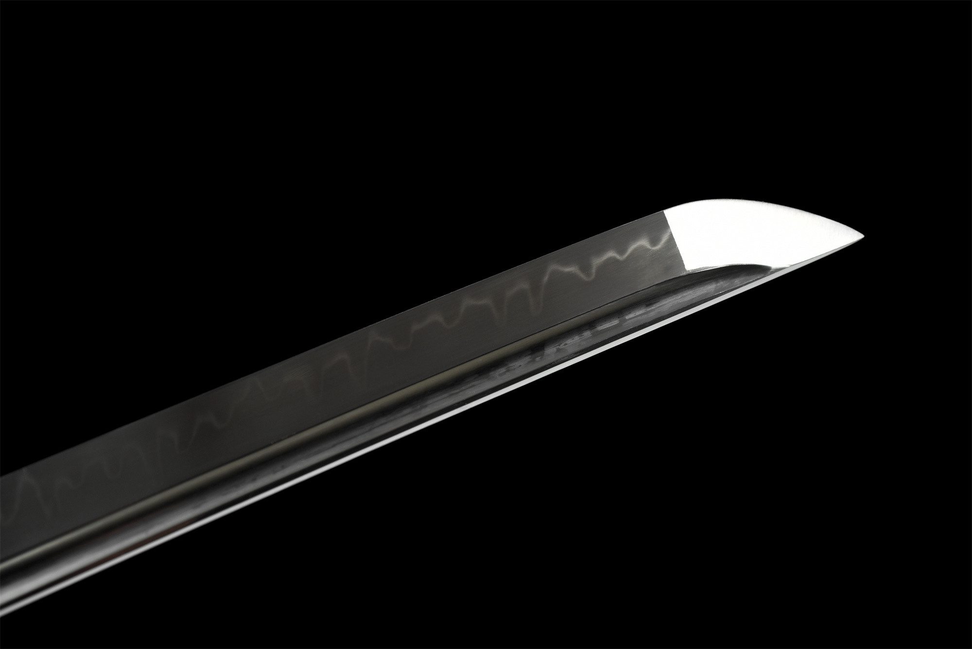 Its T10 steel blade reveals a genuine midare Hamon obtained through differential tempering, creating natural ripples that dance along the cutting edge. The bo-hi lightens the structure while producing the characteristic whistling sound during movement. The rounded brass tsuba features a finely engraved samurai, while the fuchi sports a majestic lion and the kashira ends with a dragon or lion head. The handle combines authentic stingray skin with black diamond braiding, creating a secure and elegant grip. The black and red lacquered scabbard harmonizes perfectly with the two-tone sageo, and the genuine horn koiguchi adds a touch of traditional authenticity.
