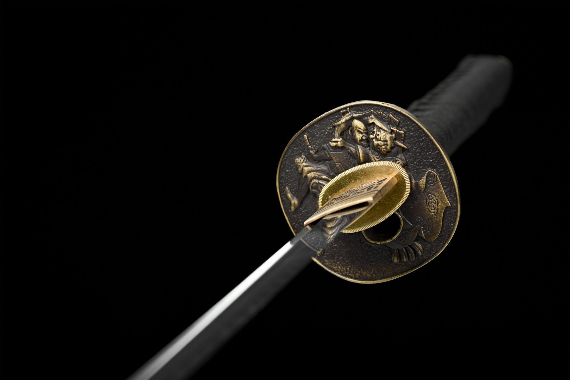 - Guard (Tsuba 鍔): Rounded brass shape with engraved samurai.