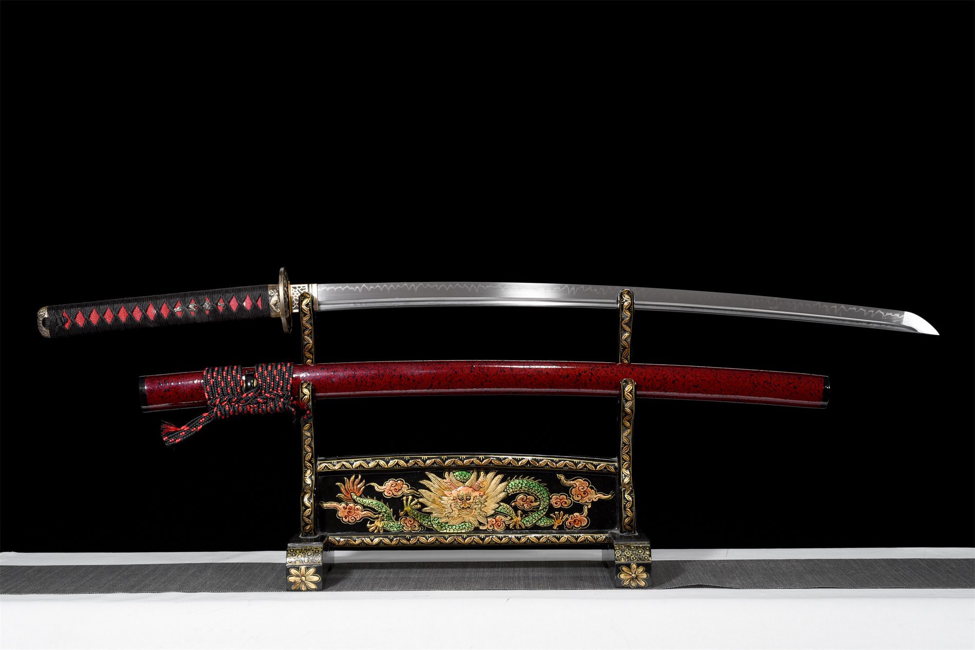 - Scabbard (Saya 鞘): Black and red lacquered wood with genuine horn Koiguchi.