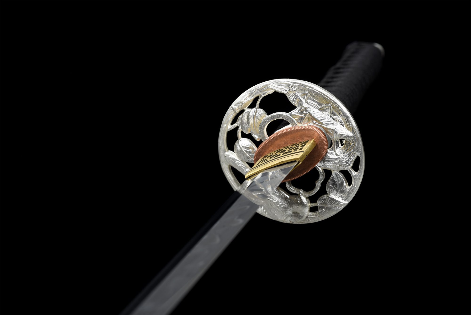 The T10 steel blade has a natural steel colour that reveals a subtle hamon, evidence of traditional differential tempering. The rounded silver-plated alloy tsuba features an engraved tree motif, symbolising growth and perseverance through the seasons. The handle harmoniously combines solid wood and black imitation stingray skin, while the black diamond-patterned tsuka-ito braiding ensures a firm and elegant grip. The menuki represent finely chiselled silver dragons, guardians of ancestral wisdom, while the matching fuchi and kashira feature delicate floral motifs on a silver background. The gilded brass habaki contrasts with its black patterns, creating a striking visual effect. The black lacquered solid wood scabbard is decorated with bamboo painting, evoking flexibility and resilience in the face of adversity.