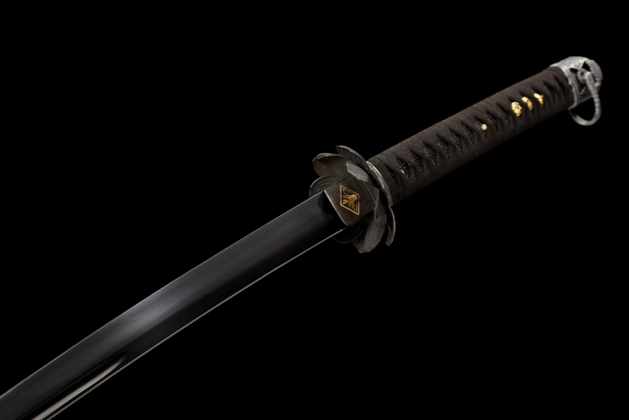 Its manganese steel blade features a deep black finish that perfectly captures the dark aesthetic of the video game. The guard (tsuba) features a beautiful copper lotus relief, symbolizing spiritual rebirth and purity emerging from troubled waters. The handle (tsuka) harmoniously combines rosewood with black faux stingray skin, covered with black diamond-patterned braiding (tsuka-ito) that ensures a firm and elegant grip. The black menuki ornaments blend discreetly into the overall design, while the silver alloy fuchi and kashira add a touch of refined contrast. The scabbard (saya) is made of aged rosewood and adorned with silver alloy ends, complemented by military-style belt loops that reinforce the functional aspect of this shinobi weapon.