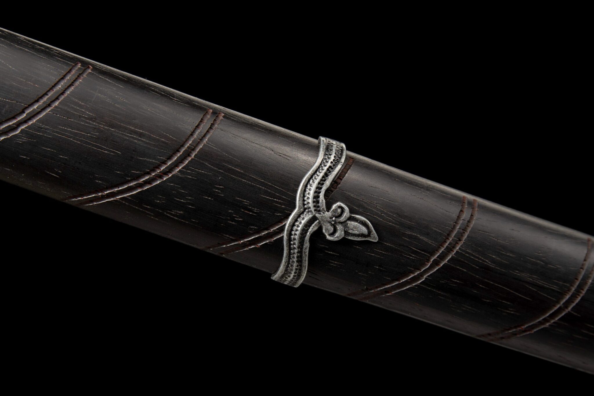 - Scabbard (Saya 鞘): Rosewood scabbard with silver alloy fittings (Kojiri and Koiguchi).