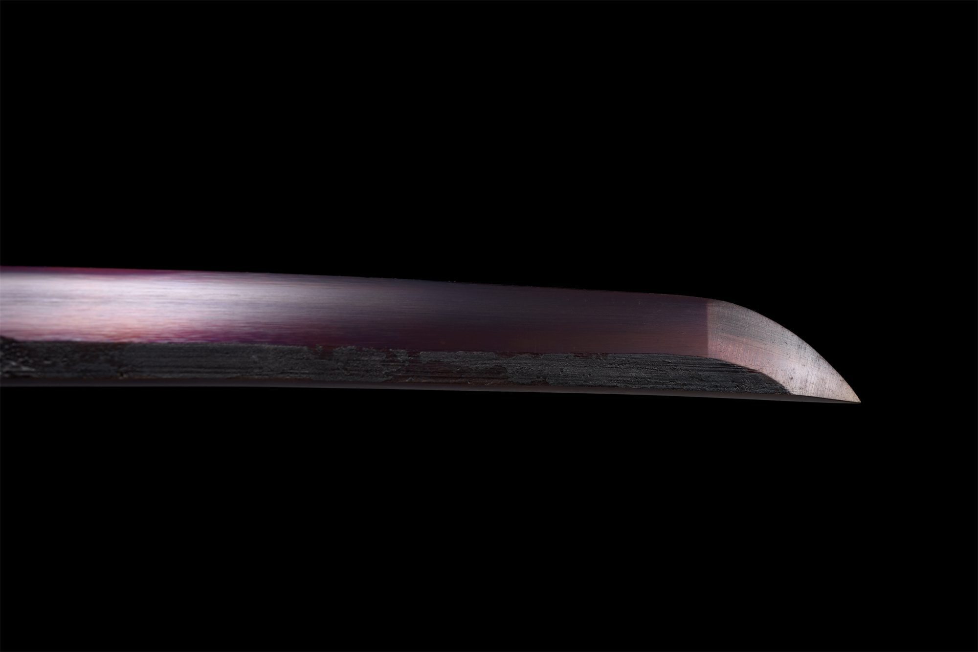 - Blue patinated manganese steel blade with silver, purple and red highlights, sharpened or unsharpened at choice, full tang.