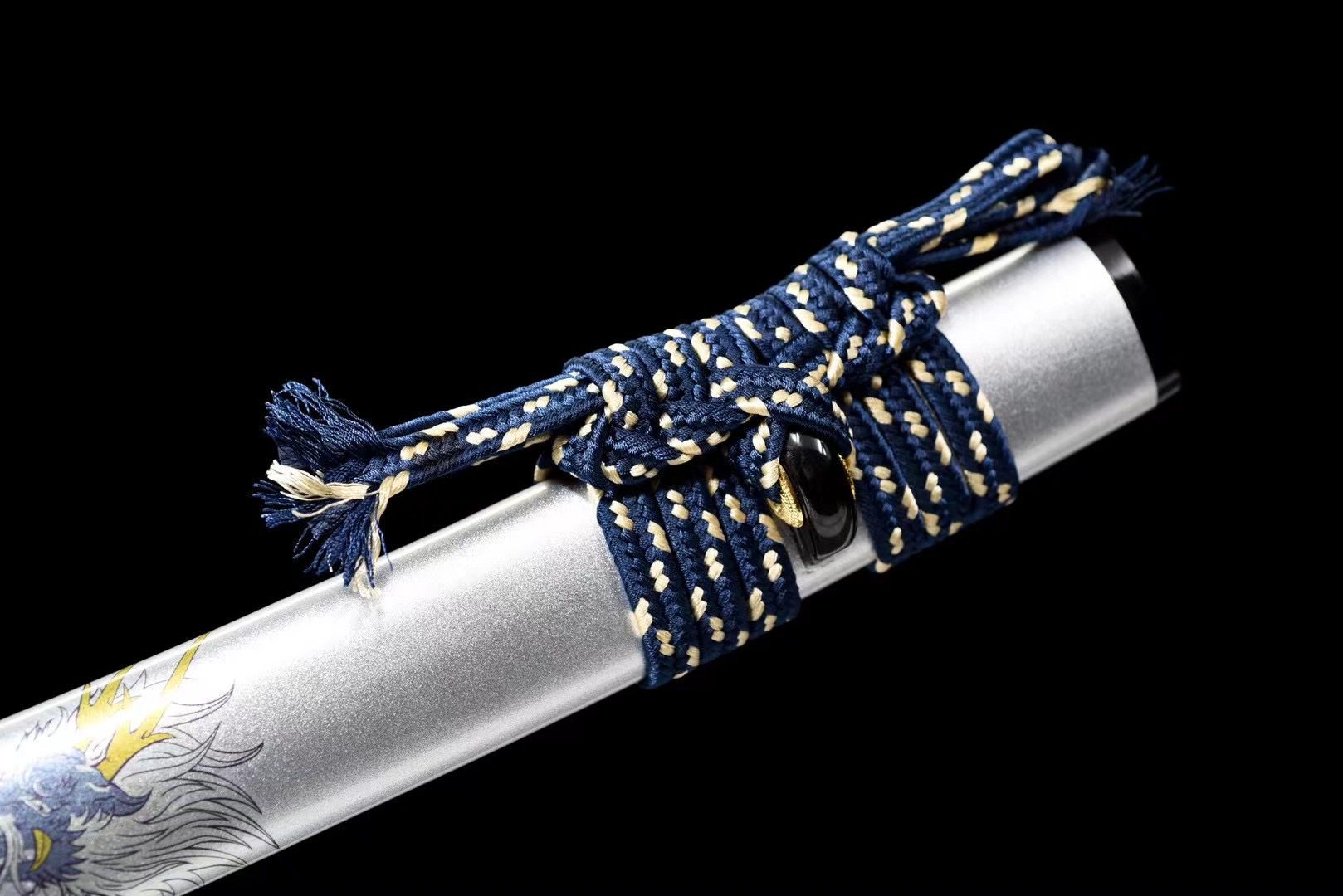 The T10 steel blade reveals an authentic gunome hamon, the result of differential tempering that creates irregular waves along the cutting edge. The bo-hi carved into the steel lightens the blade while producing a characteristic whistling sound when moved. The round tsuba features a striking contrast between black and white, enhanced by delicate gilding that evokes the balance of opposing forces. The handle, covered in white samegawa and braided with immaculate tsuka-ito in a diamond pattern, features menuki representing golden dragons. The white alloy fuchi and kashira adorned with golden flowers complete this chromatic harmony, while the gray lacquered scabbard is decorated with a blue and yellow dragon that seems to come to life on its polished surface.