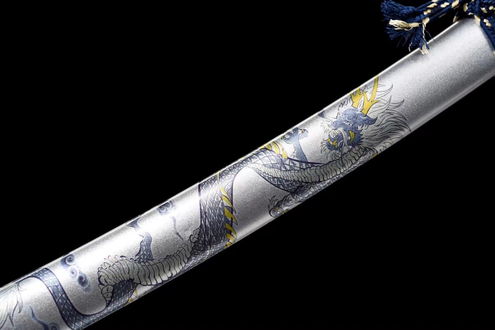 - Scabbard (Saya 鞘): gray lacquered wooden scabbard decorated with a blue and yellow dragon, black kojiri and koiguchi.